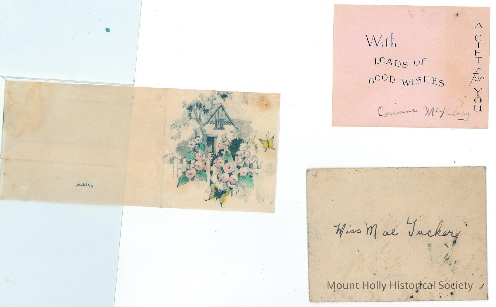 Card with envelope and picture, probably accompanying gift to Mae Tucker from Corinne McKelvey [?]