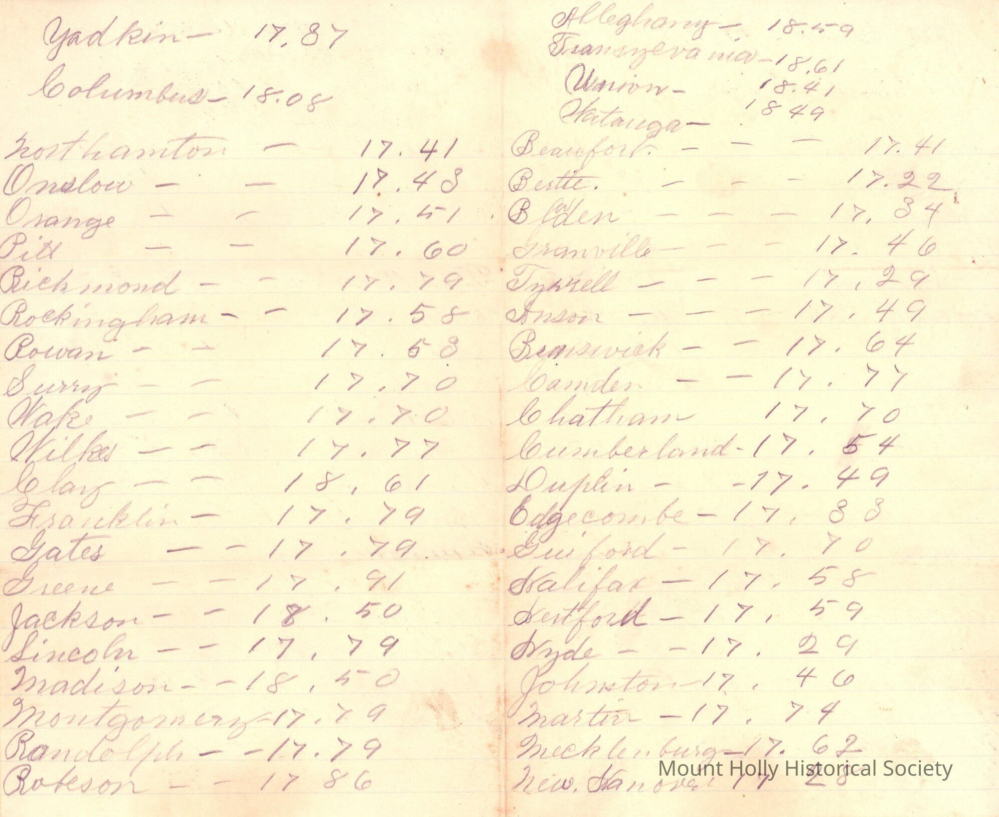 Handwritten list of NC counties, arranged in order of their establishment from oldest to most recent (scanned front and back)