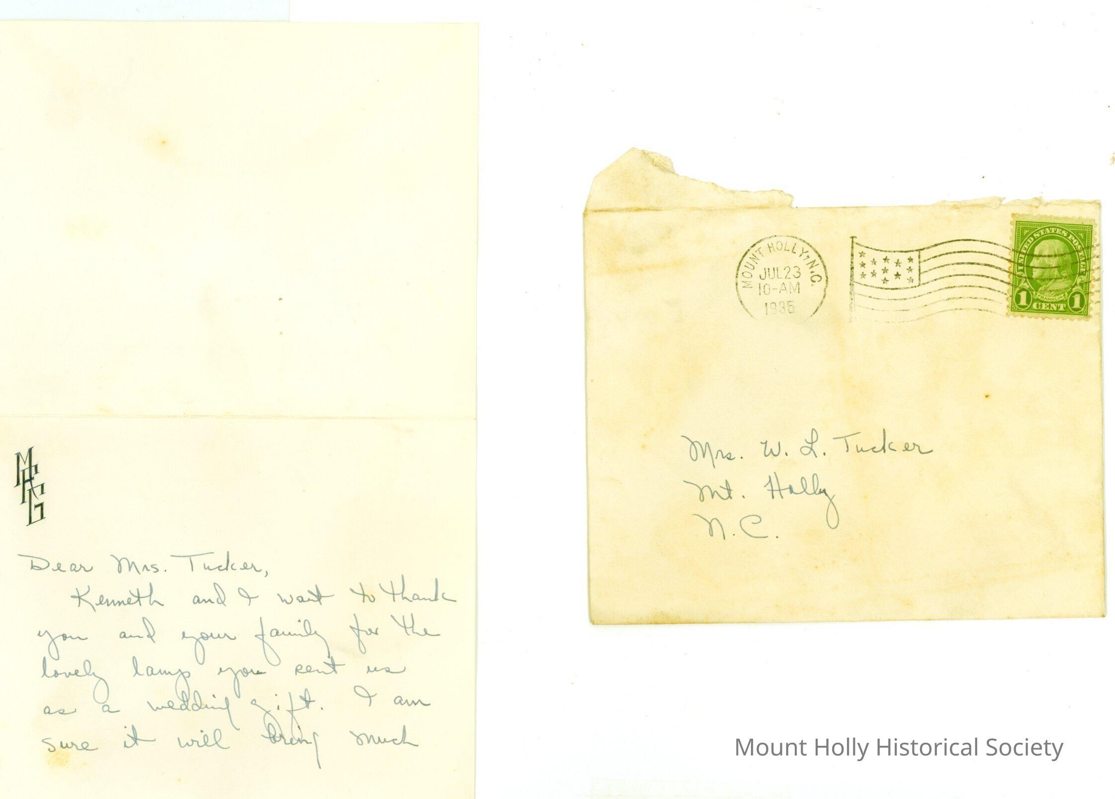 Note from Margaret Farrar Gallup to Mrs. Tucker, thanking her for giving her a lamp as a wedding gift (envelope scanned)
