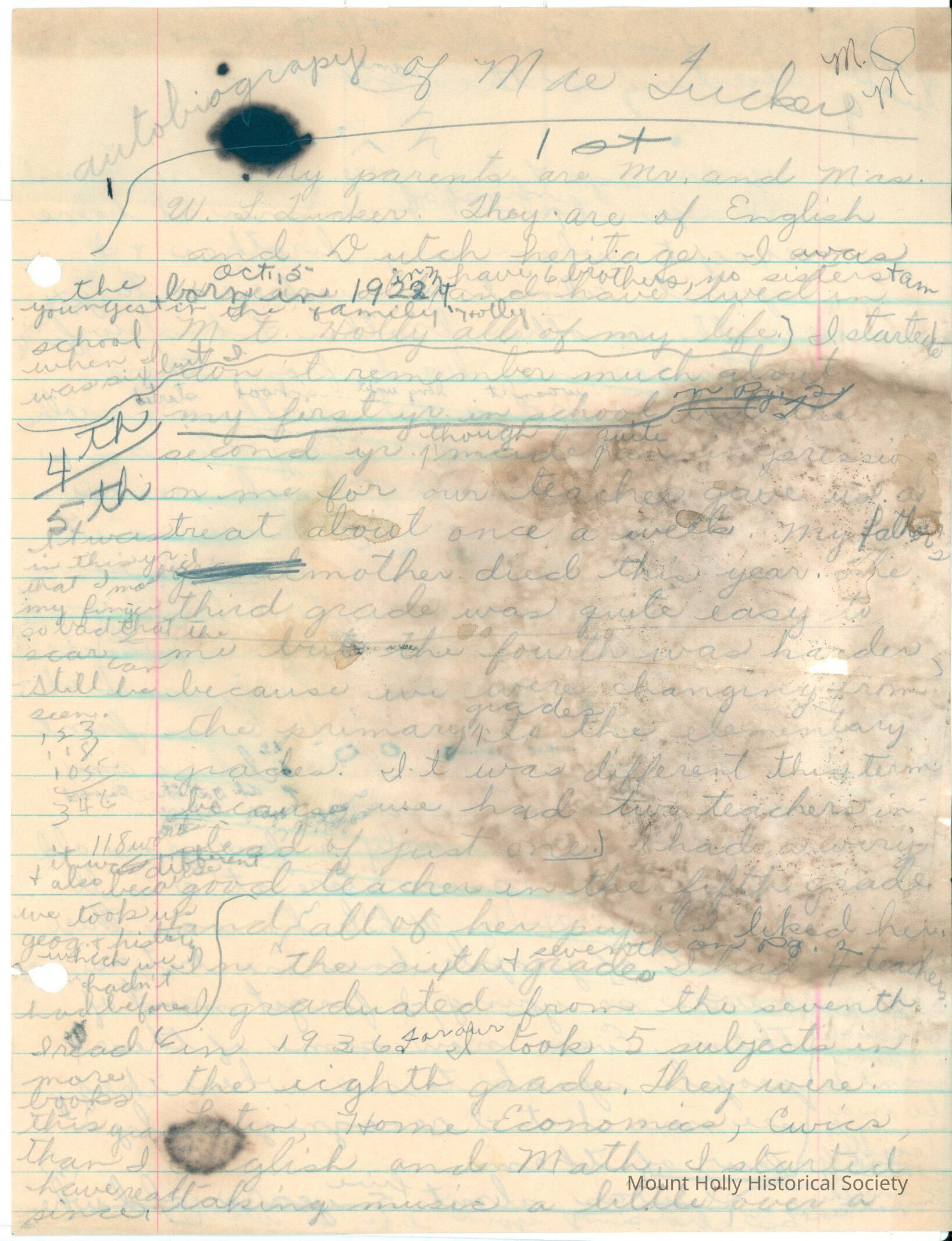 Three-page "Autobiography of Mae Tucker"; likely a school assignment, with corrections