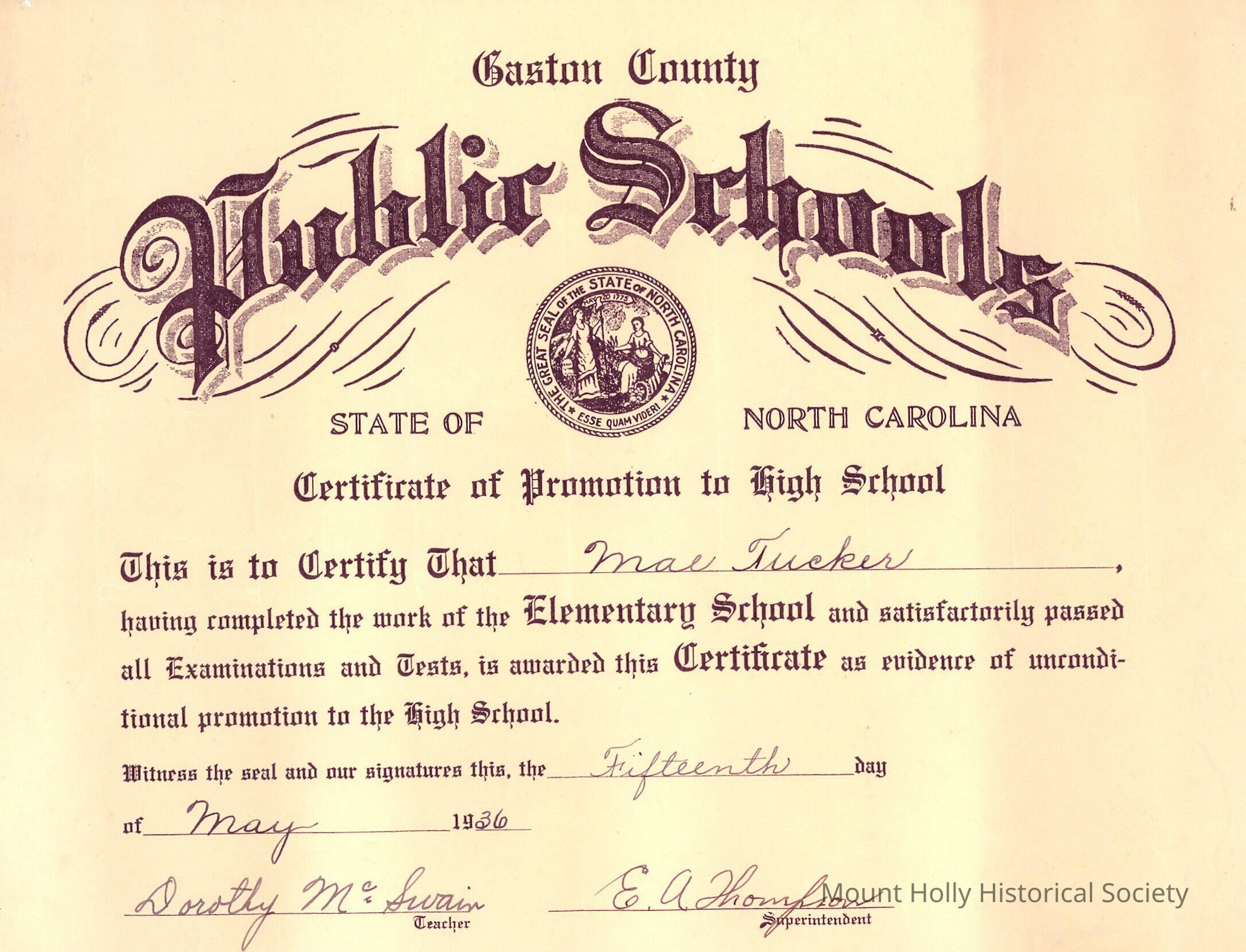 Certificate promoting Mae Tucker to high school, signed by Dorothy McSwain and E.A. Thompson