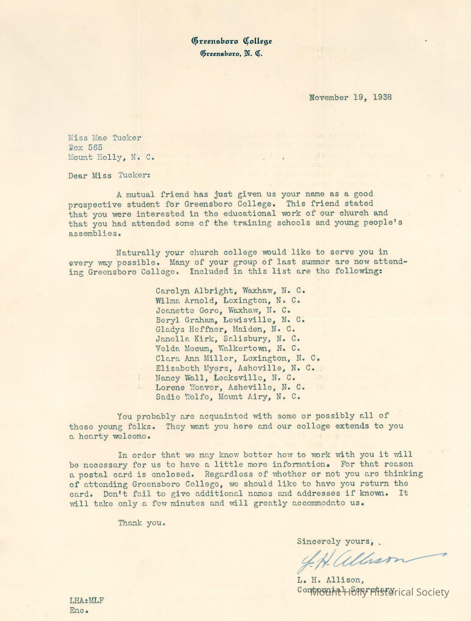 Letter from Greensboro College to Mae Tucker, offering her the chance to apply, along with envelope and return postcard (scanned separately)