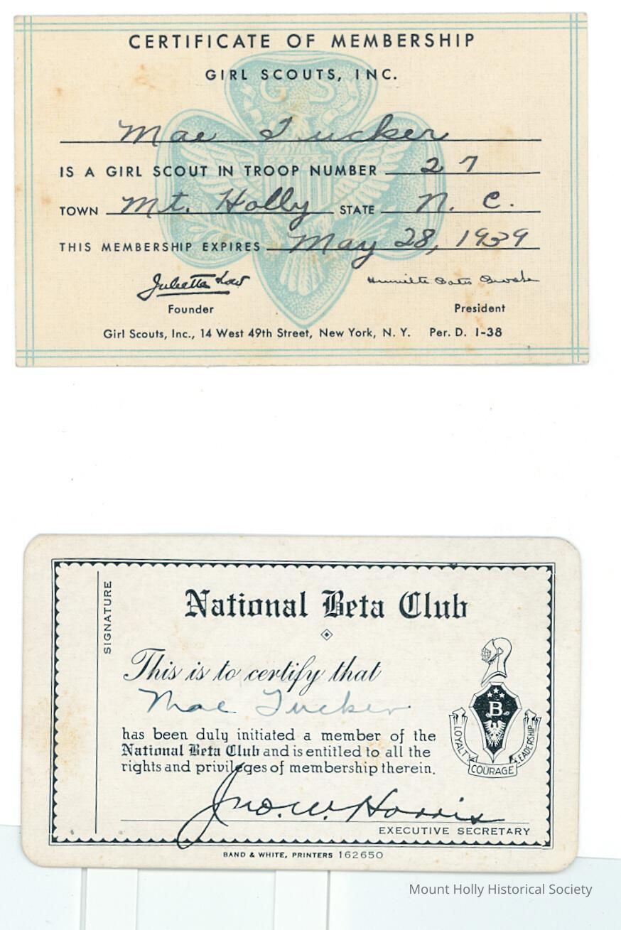 Two membership cards for Mae Tucker: (A) Girl Scout certificate; (B) National Beta Club (front and back scanned for each)