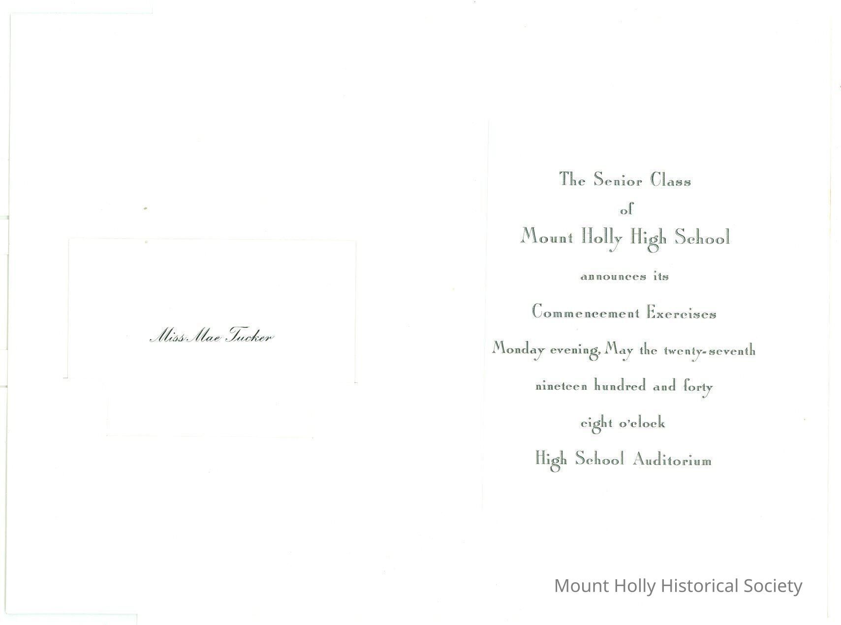 Card announcing commencement exercises for Mt. Holly High School on May 27, with Mae Tucker's card and two envelopes (not scanned)