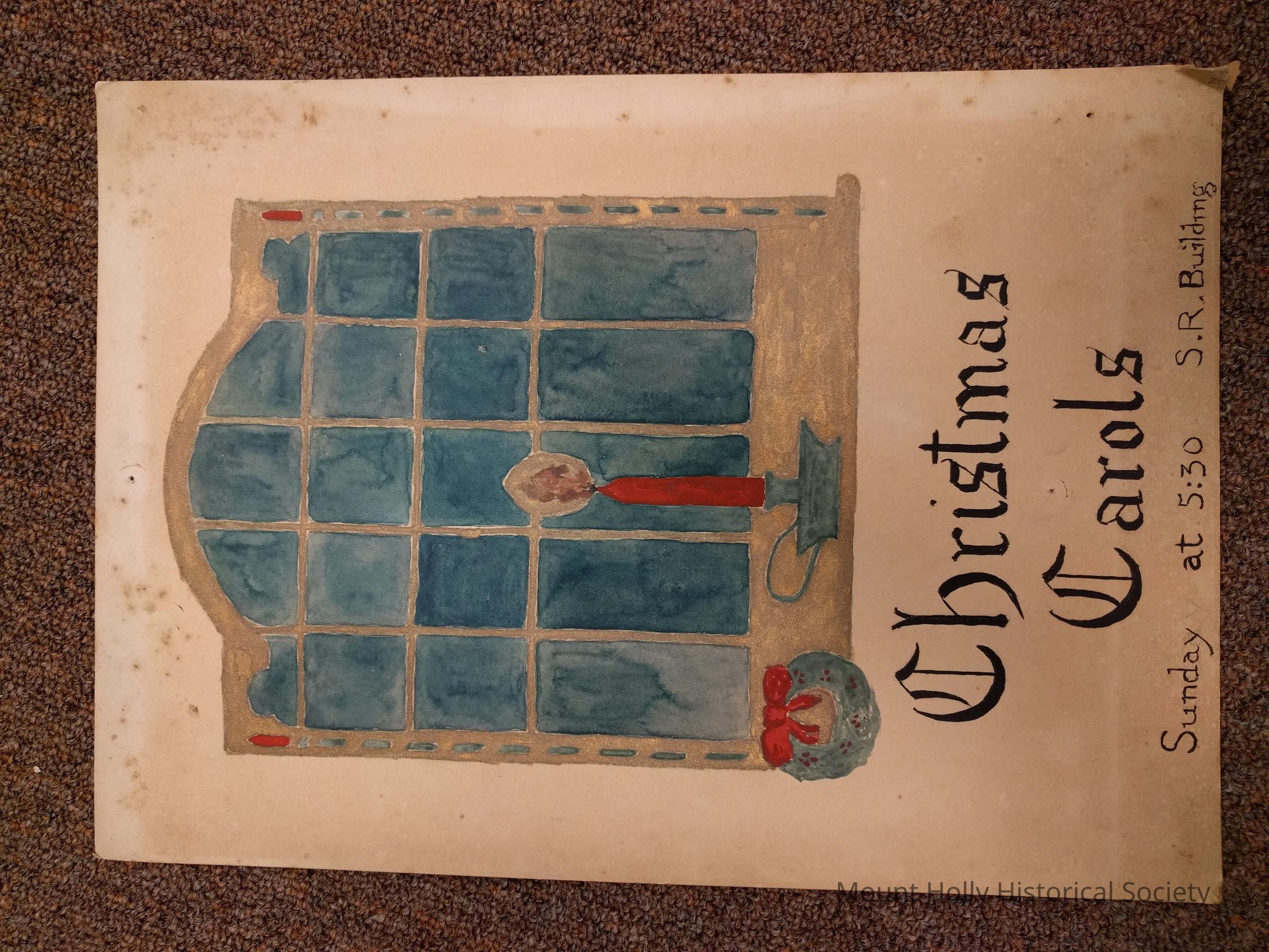 Pained sign adverstising "Christmas Carols Sunday at 5:30 S.R. Building" About 14" x 8"