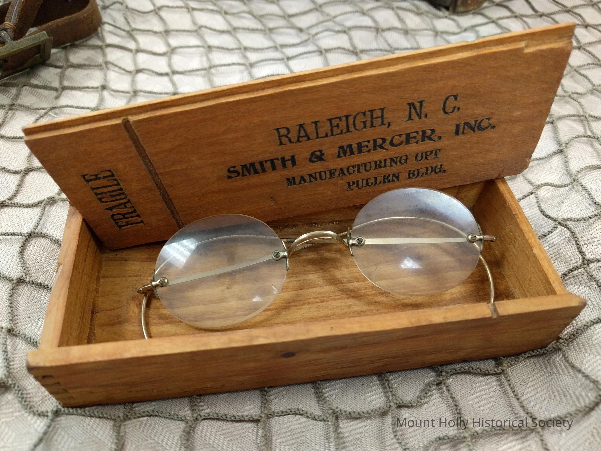 Eyeglasses in wooden box Top stamped "Fragile / Raleigh, NC / Smith & Mercer, Inc / Manufacturing Opt / Pulling Bldg."