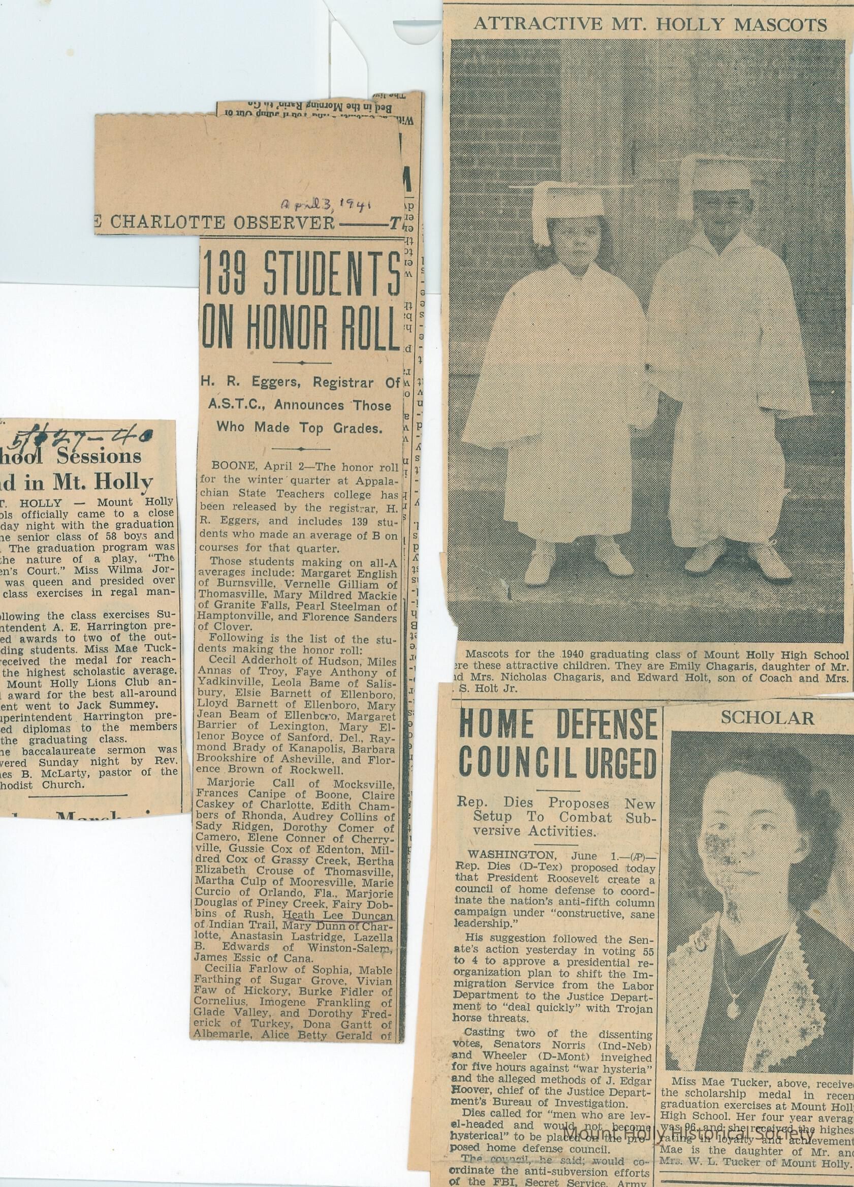 Four clippings from various newspapers, all mentioning Mae Tucker in connection with high school graduation or grades at Appalachian State