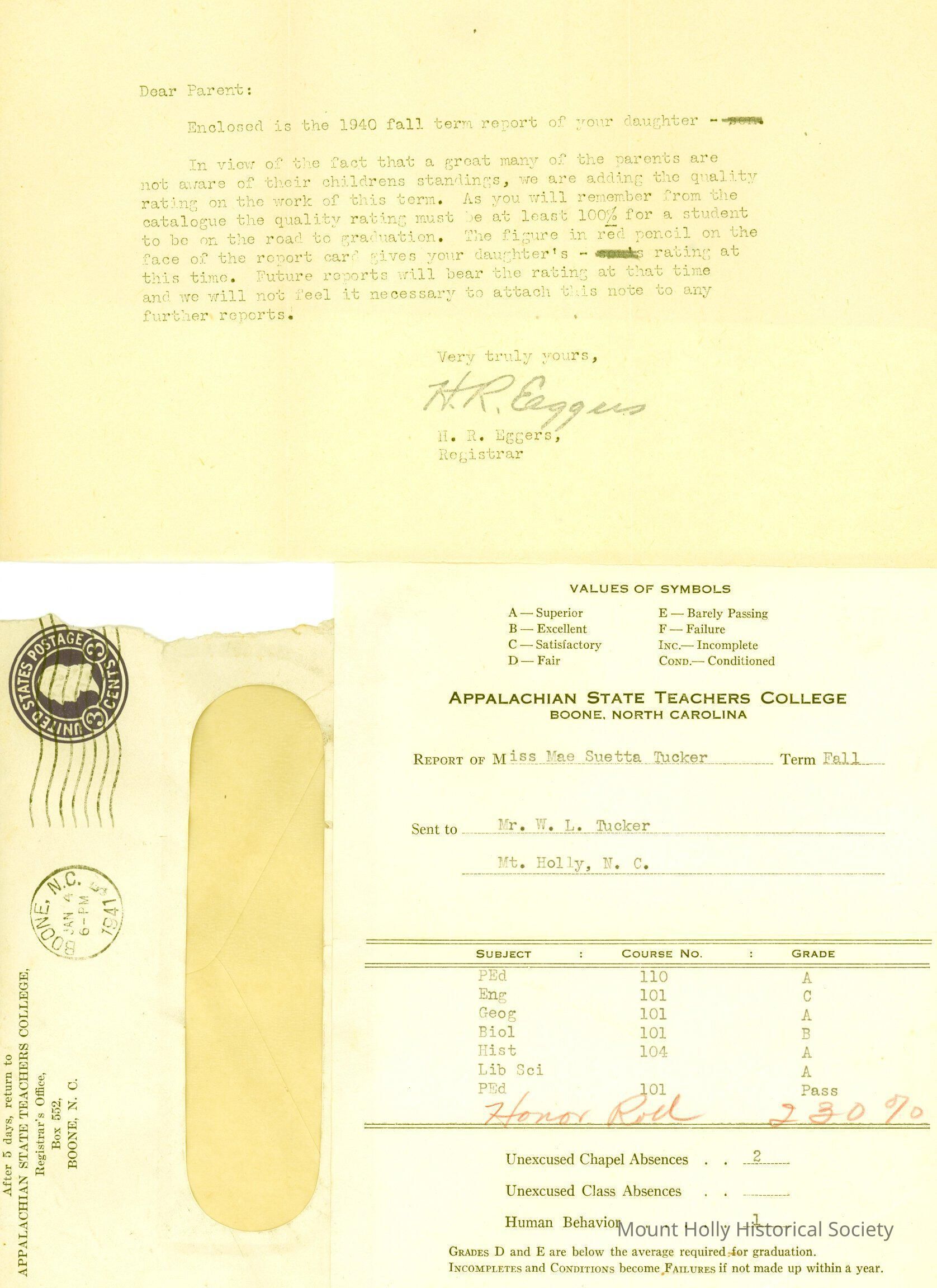 Report card for Mae Tucker from Appalachian State for fall semester of 1940, scanned together with envelope and note explaining grades