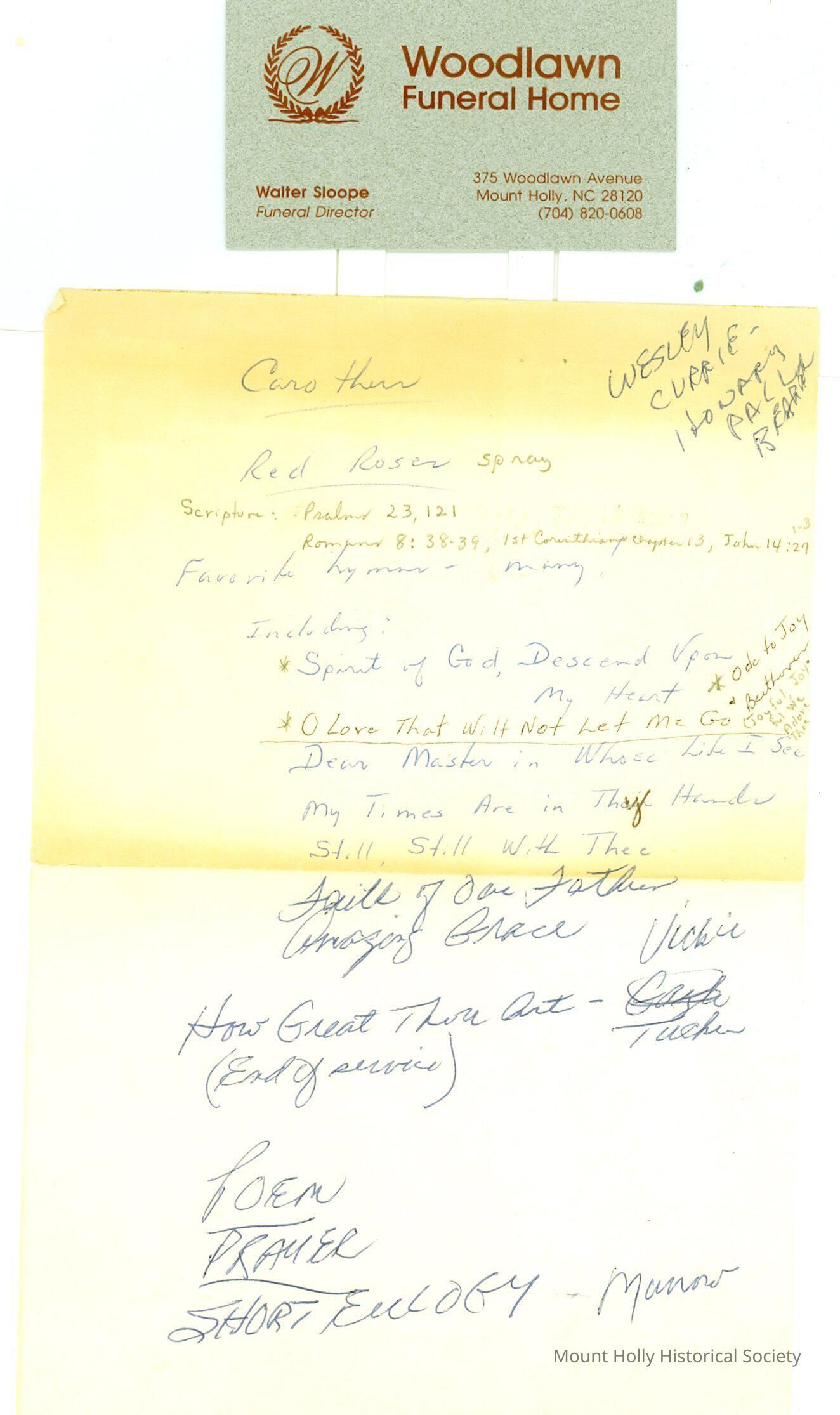 (1) Handwritten list of hymns and scripture lessons for funeral of unknown person; (2) business card of Walter Sloope, director of Woodlawn Funeral Home