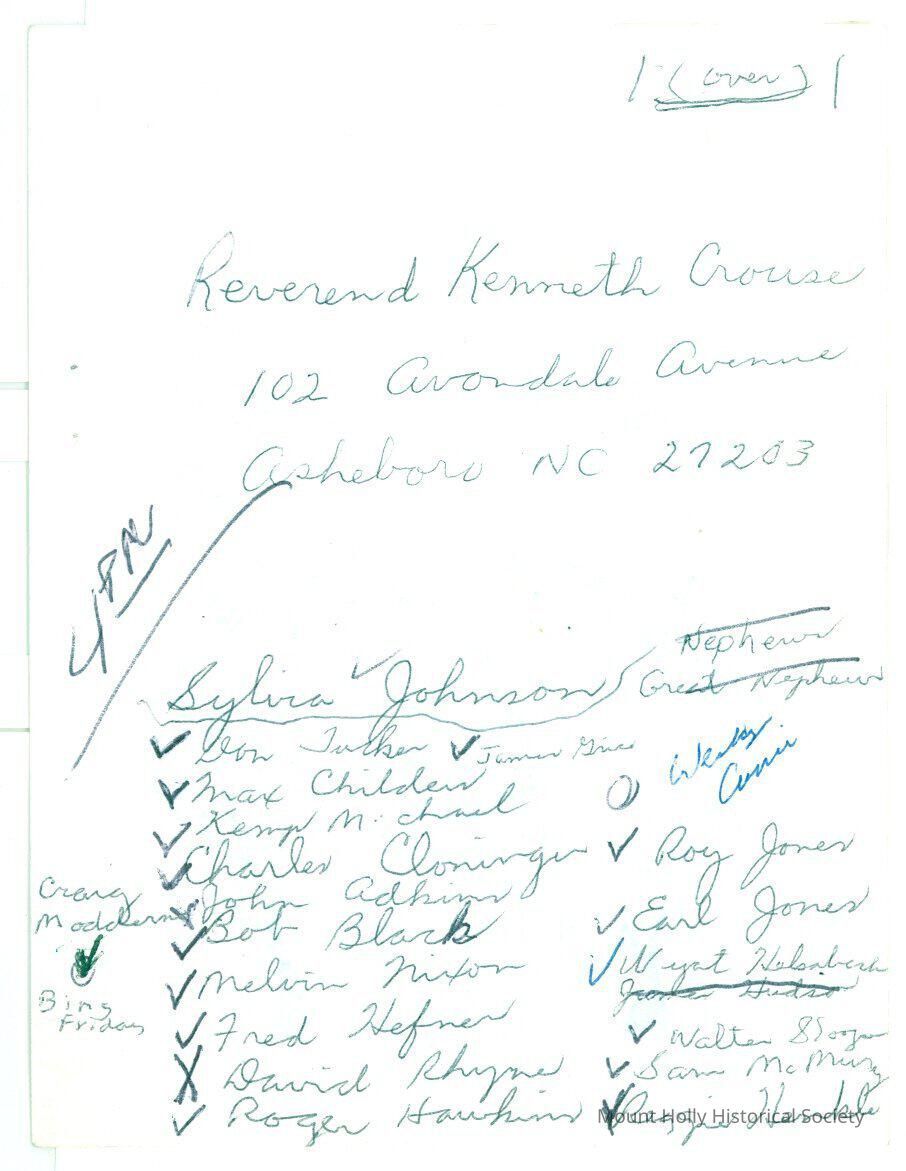 Document (front and back scanned) with address of Rev. Kenneth Crouse and list of names