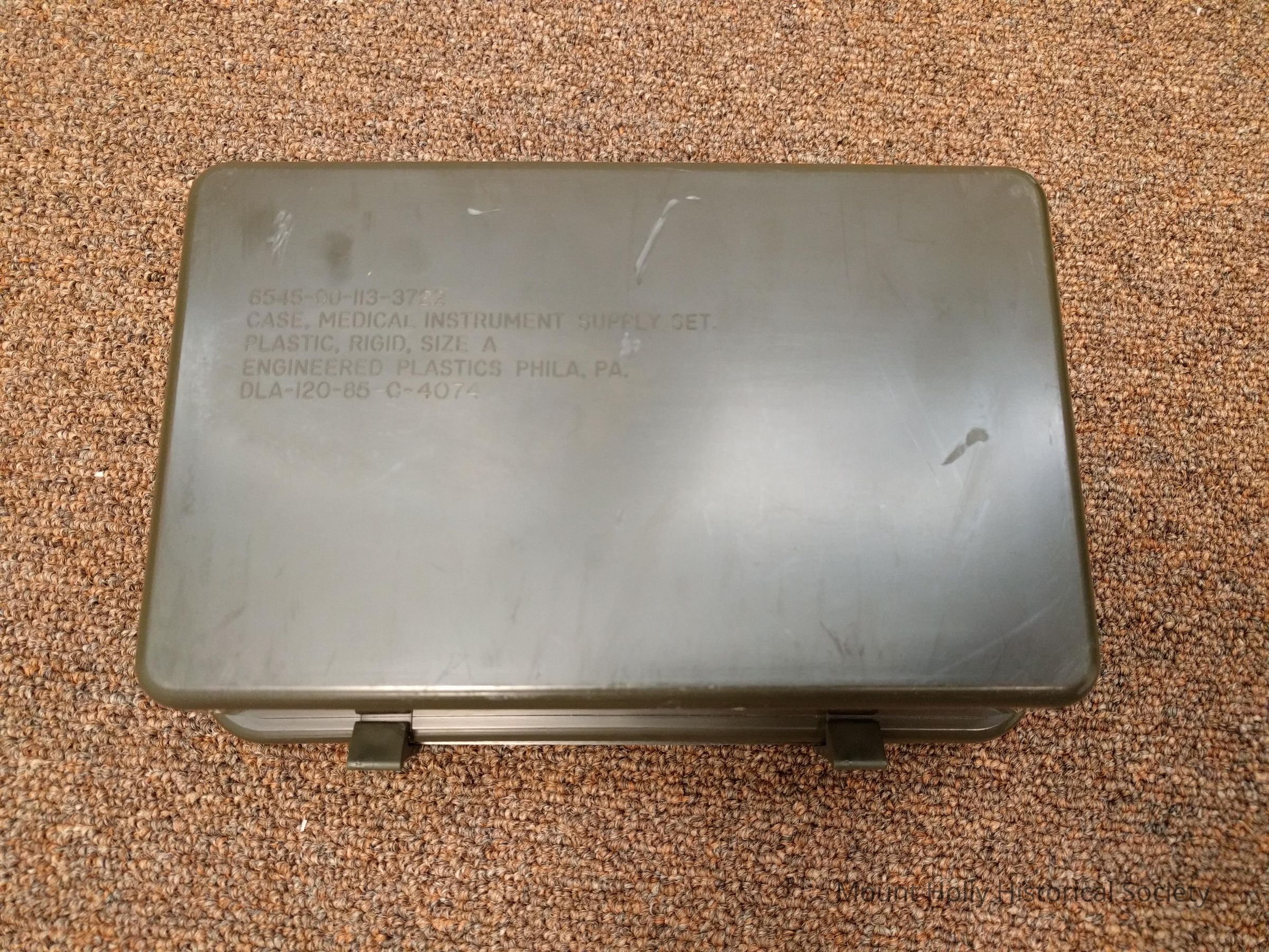 Backside stamped "Case, Medical Instrument Supply Set / Plastic, rigid, size A / Engineered plastics Philiadephia, PA / DLA-120-85 C-4074"