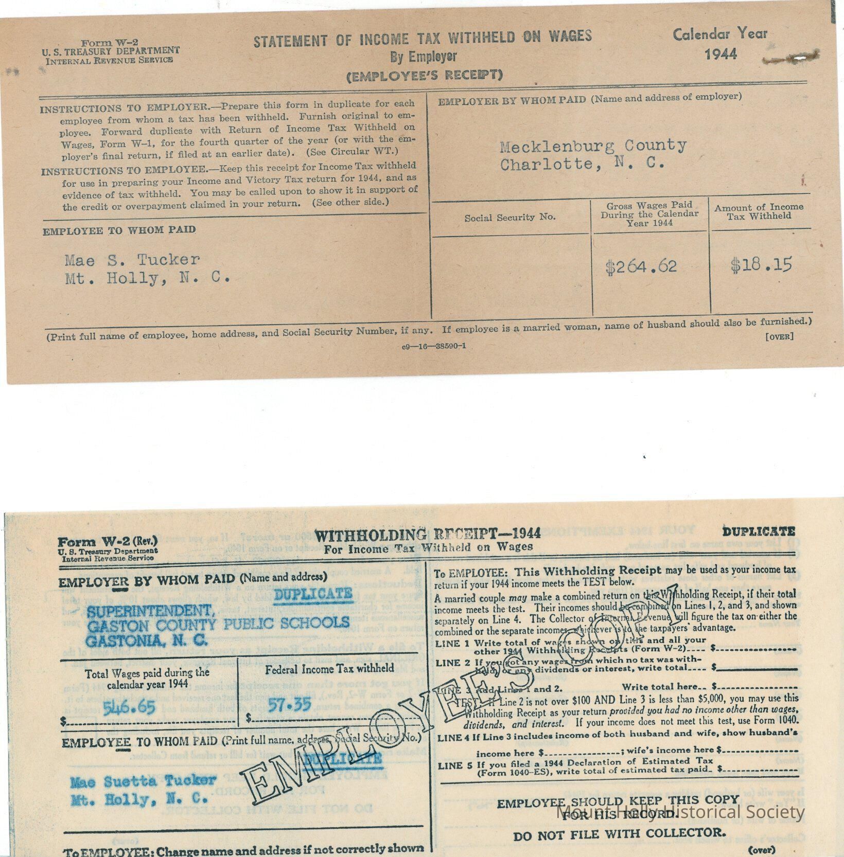Four school fund vouchers for Mae Tucker; two statements of income tax withheld for 1944; one withholding receipt; one letter from the school board to Mae Tucker (ony two documents scanned)