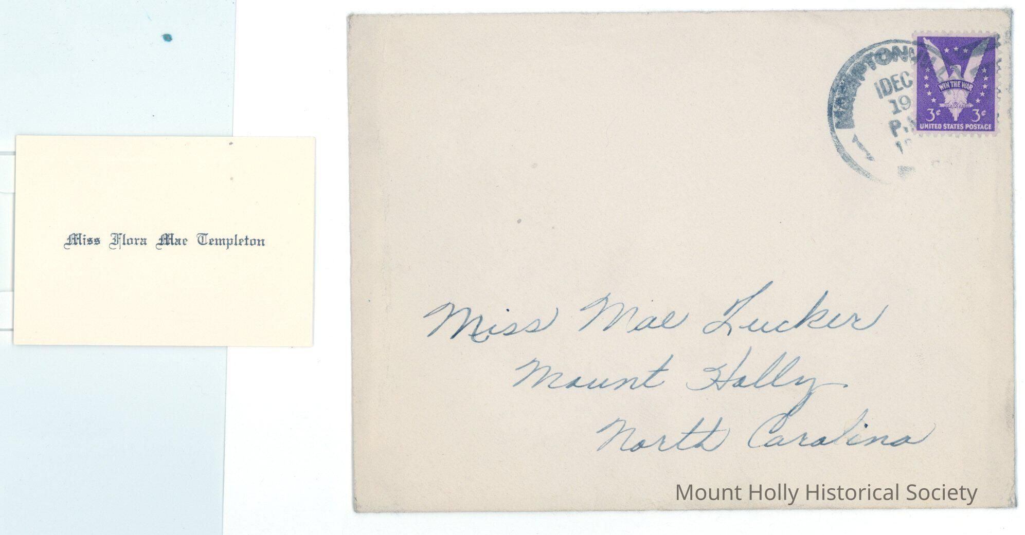 Announcement for Flora Mae Templeton's graduation from Appalachian State Teachers College (Dec. 19, 1944) with enveloped addressed to Mae Tucker