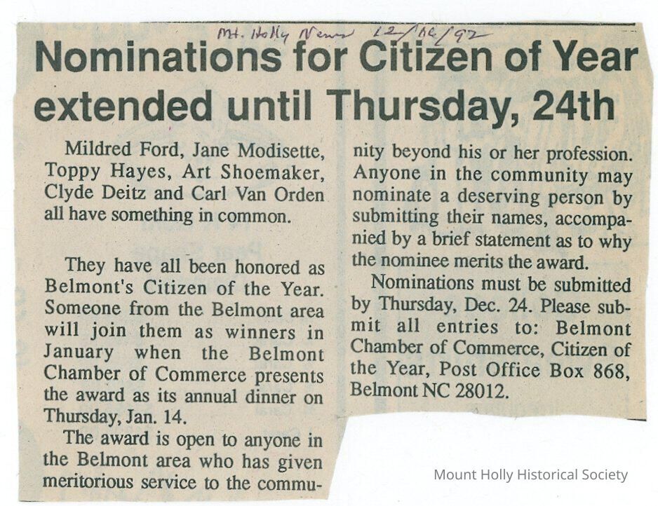 Clipping from "Mt. Holly News" (dated 12/?/92) announcing that the Belmont Chamber of Commerce would accept nominations for the Citizen of the Year