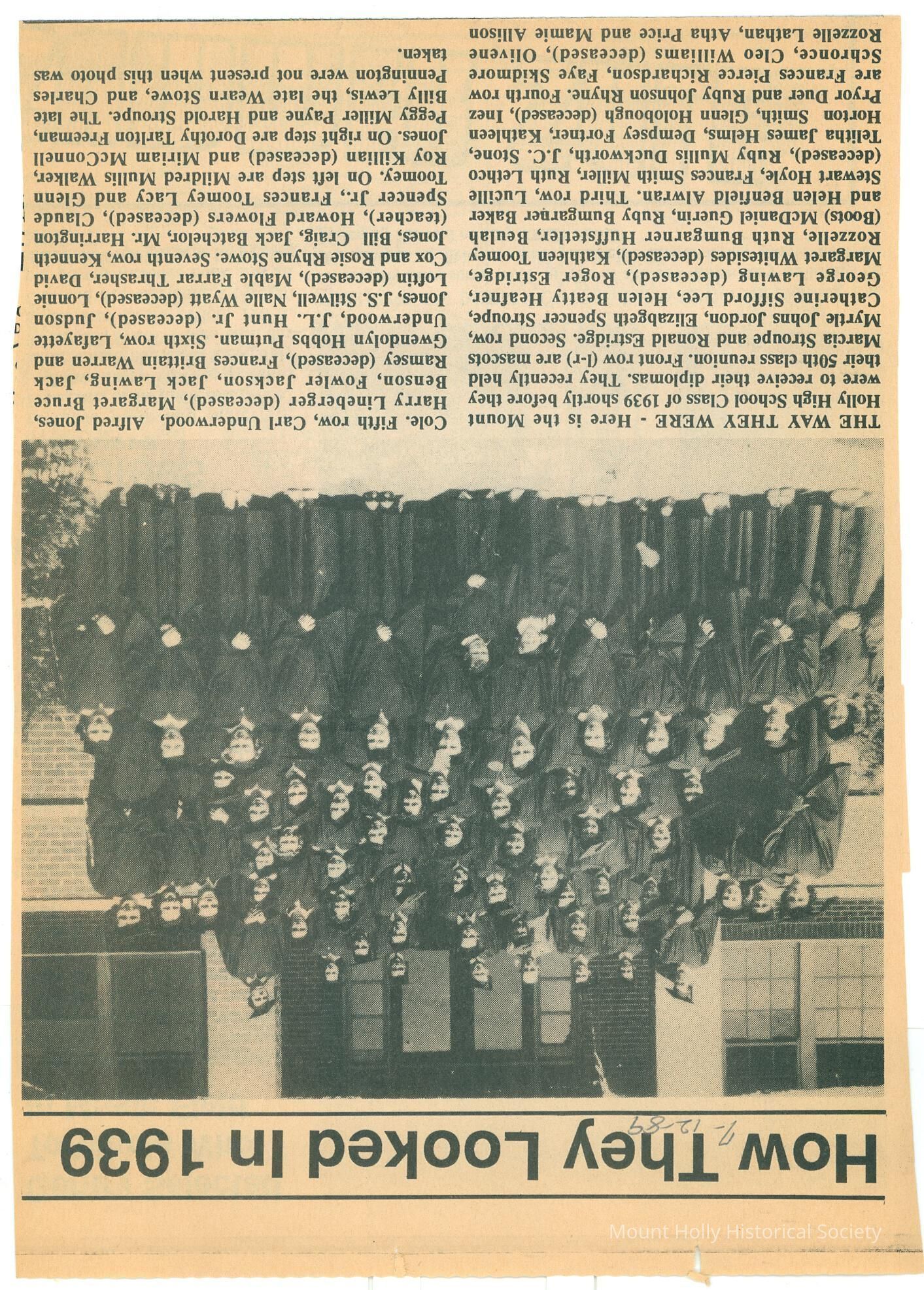 Republication of 1939 Mt. Holly High School graduating class's photo in newspaper, with photo of 1989 reunion below