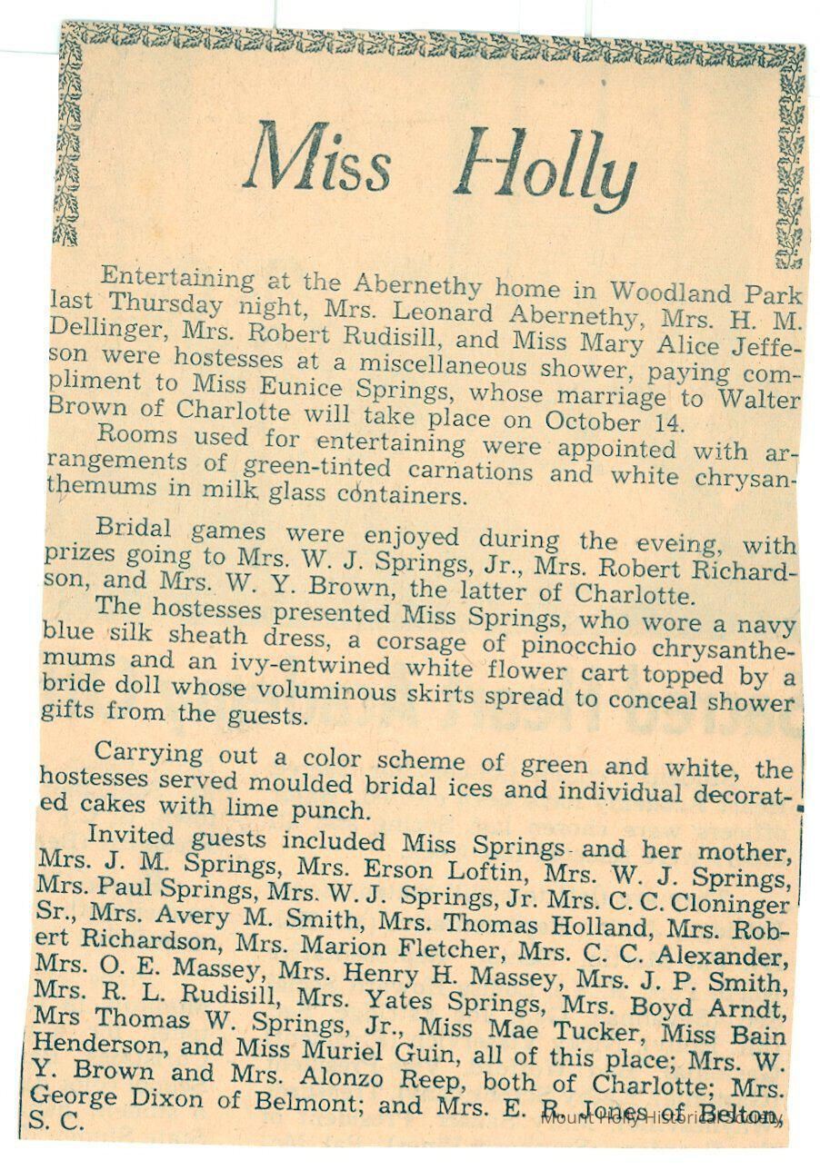Newspaper article mentioning bridal shower for Miss Eunice Springs, with Mae Tucker in attendance as guest