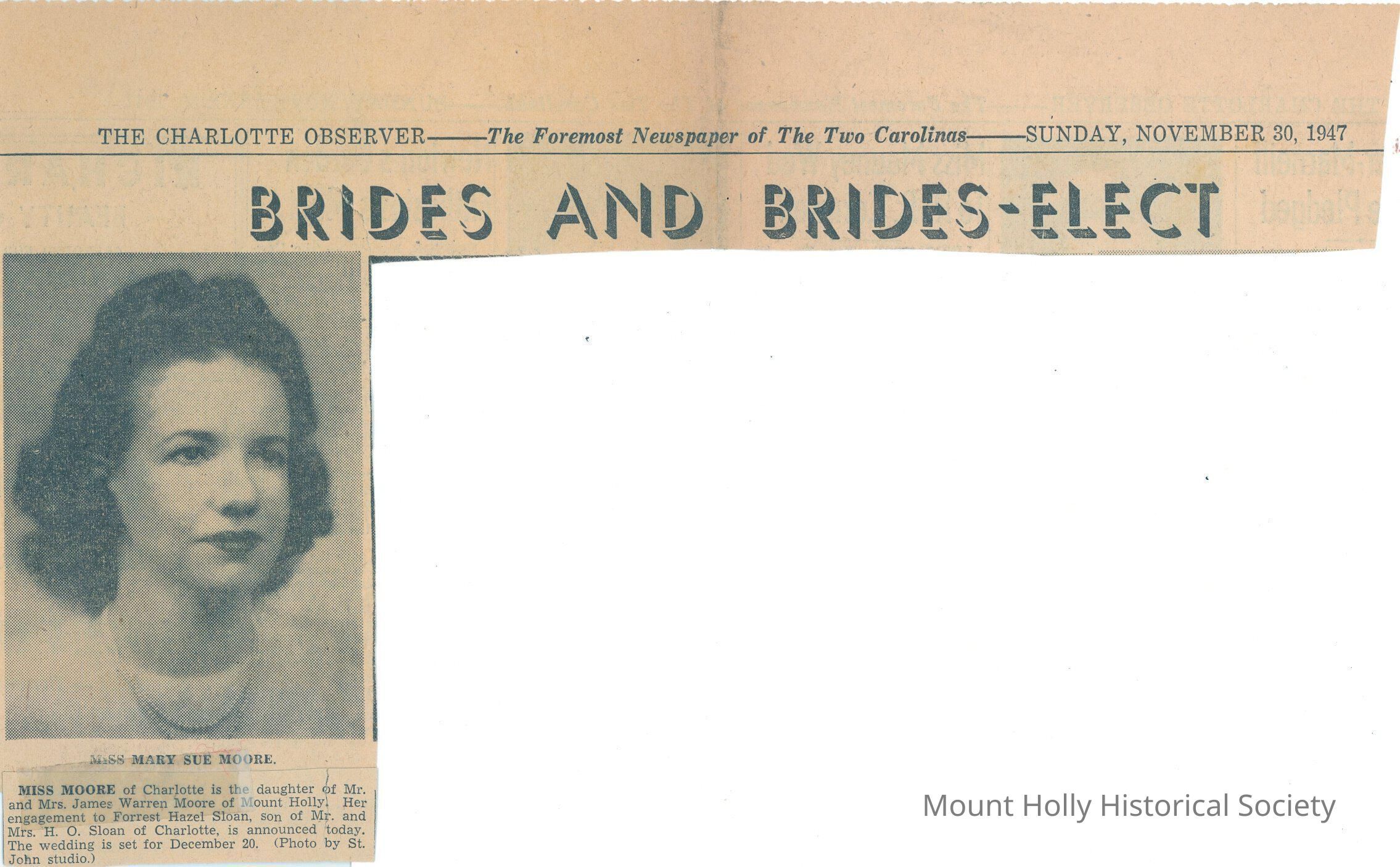Announcement in "Charlotte Observer" of engagement of Mary Sue Moore to Forrest Hazel Sloan