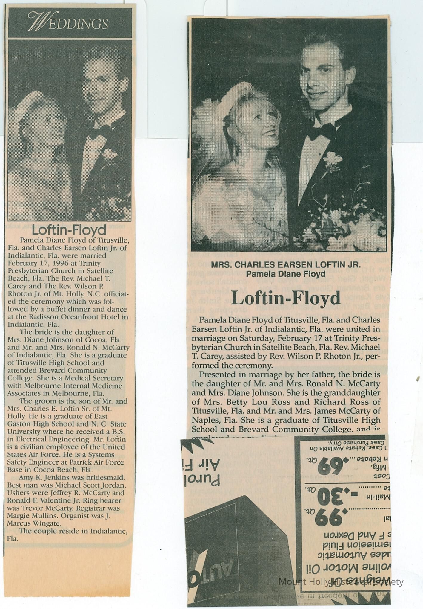 Two newspaper clippings describing wedding of Pamela Floyd to Charles Loftin, Jr.