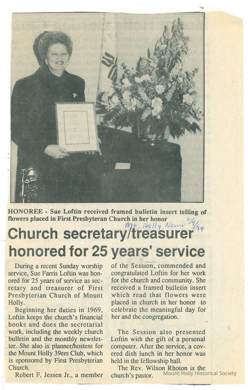 Article from "Mt. Holly News" describing Sue Loftin being honored for 25 years of service at the First Presbyterian Church
