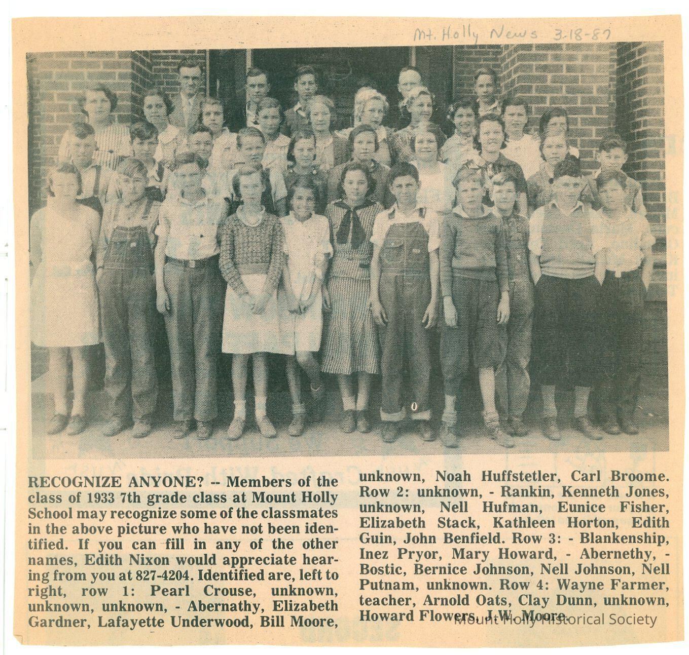Article from "Mt. Holly News" reprinting photo of class of 1933 seventh-grade class at Mt. Holly School with caption
