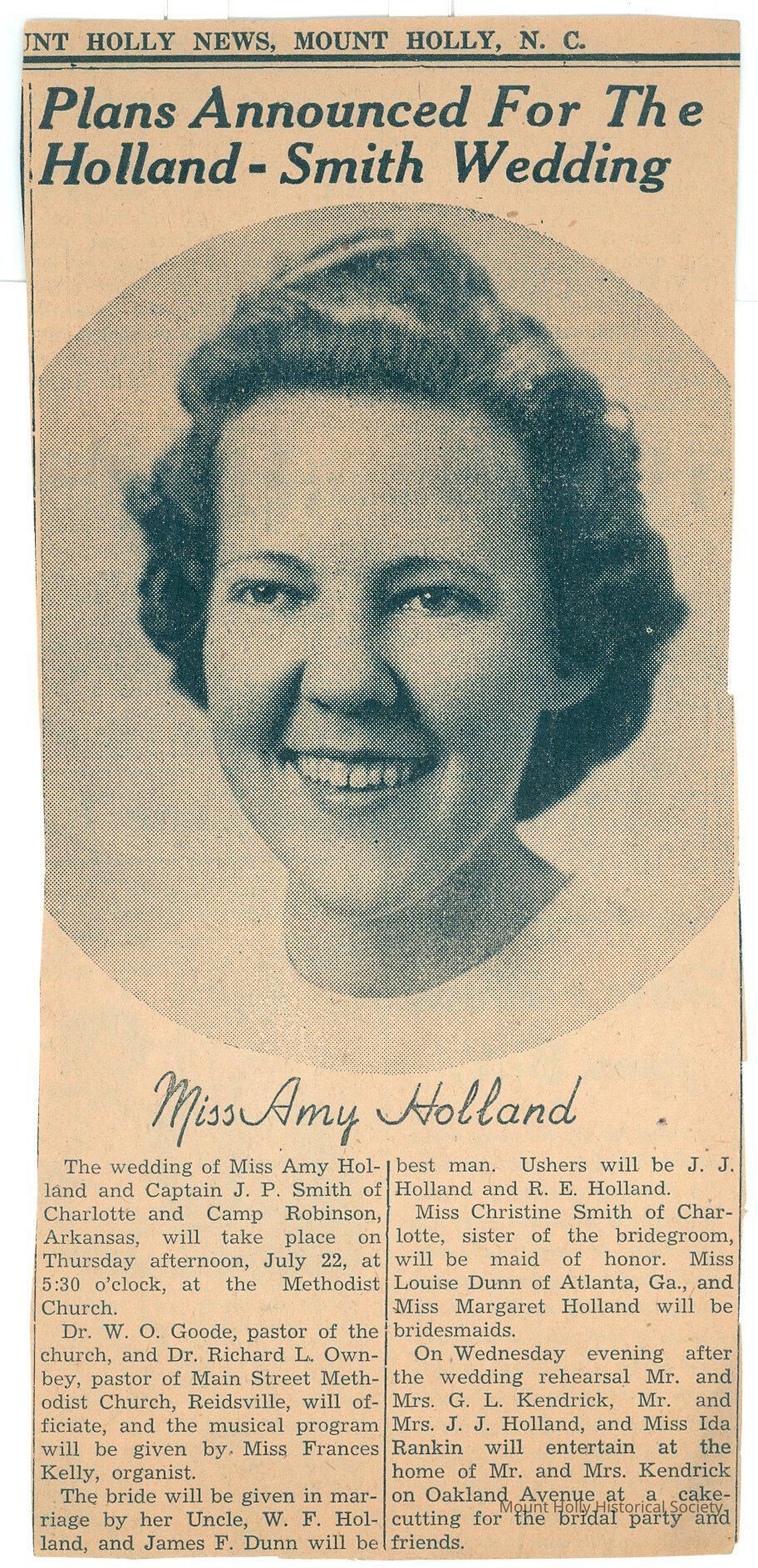 Article from "Mt. Holly News" announcing the marriage of Amy Holland to Captain J.P. Smith at Methodist Church