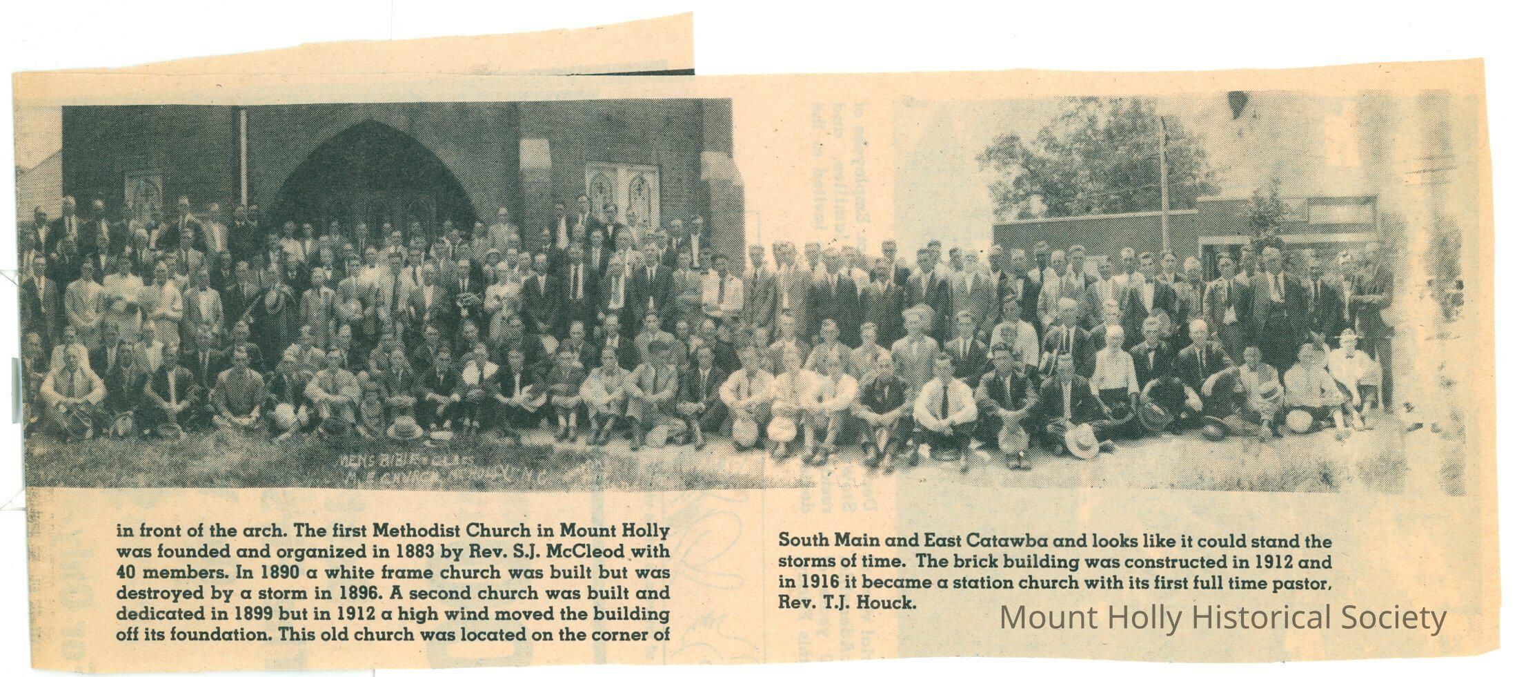 Clipping from "Mt. Holly News" reprinting photo (with caption) of Men's Bible Class at the old Methodist Church in 1916-17 (clipping folded)