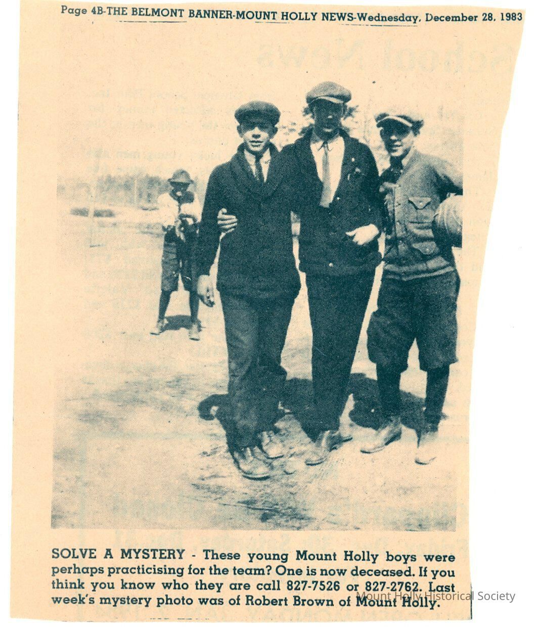 Photo from "Mt. Holly News" and "Belmont Banner" asking readers to identify three young men with ball on playing field