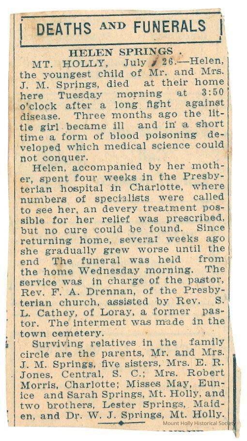Brief obituary from unknown newspaper describing death of Helen Springs