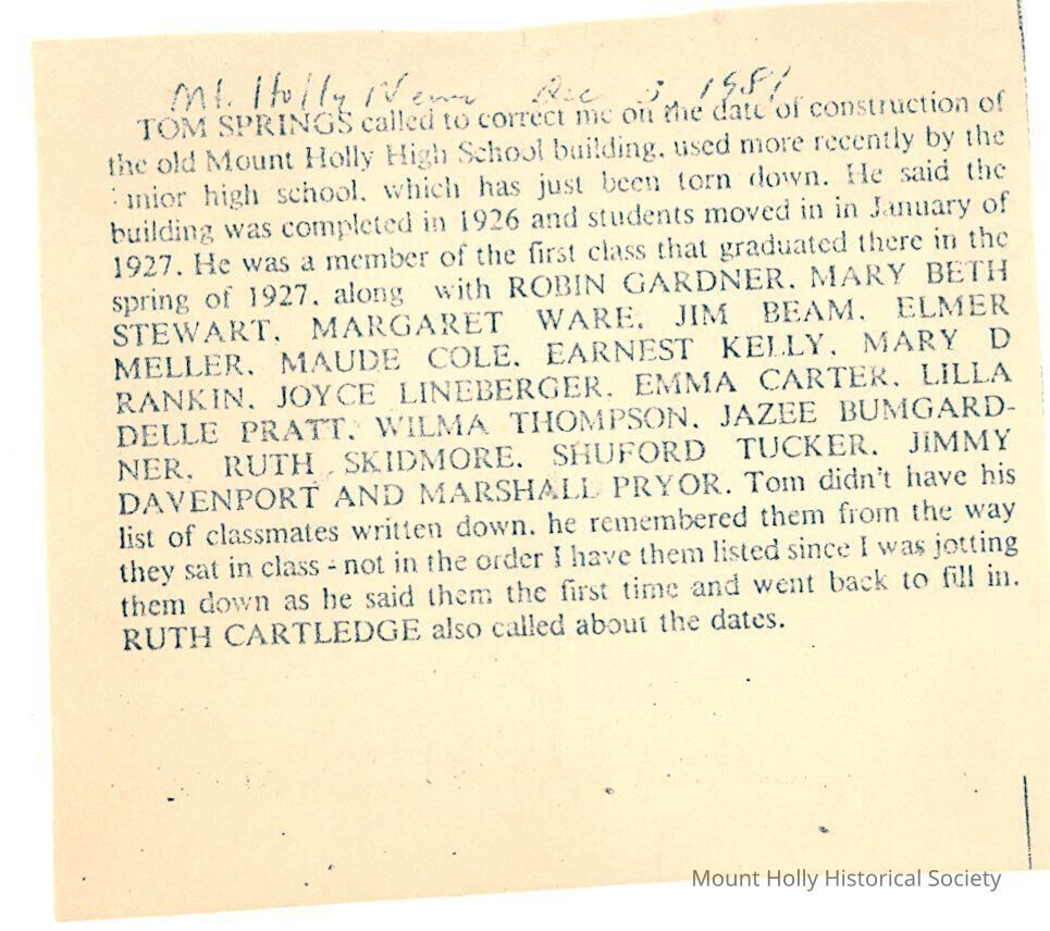 Brief notice from "Mt. Holly News" stating that Tom Springs had corrected information about the construction of the old Mt. Holy High School