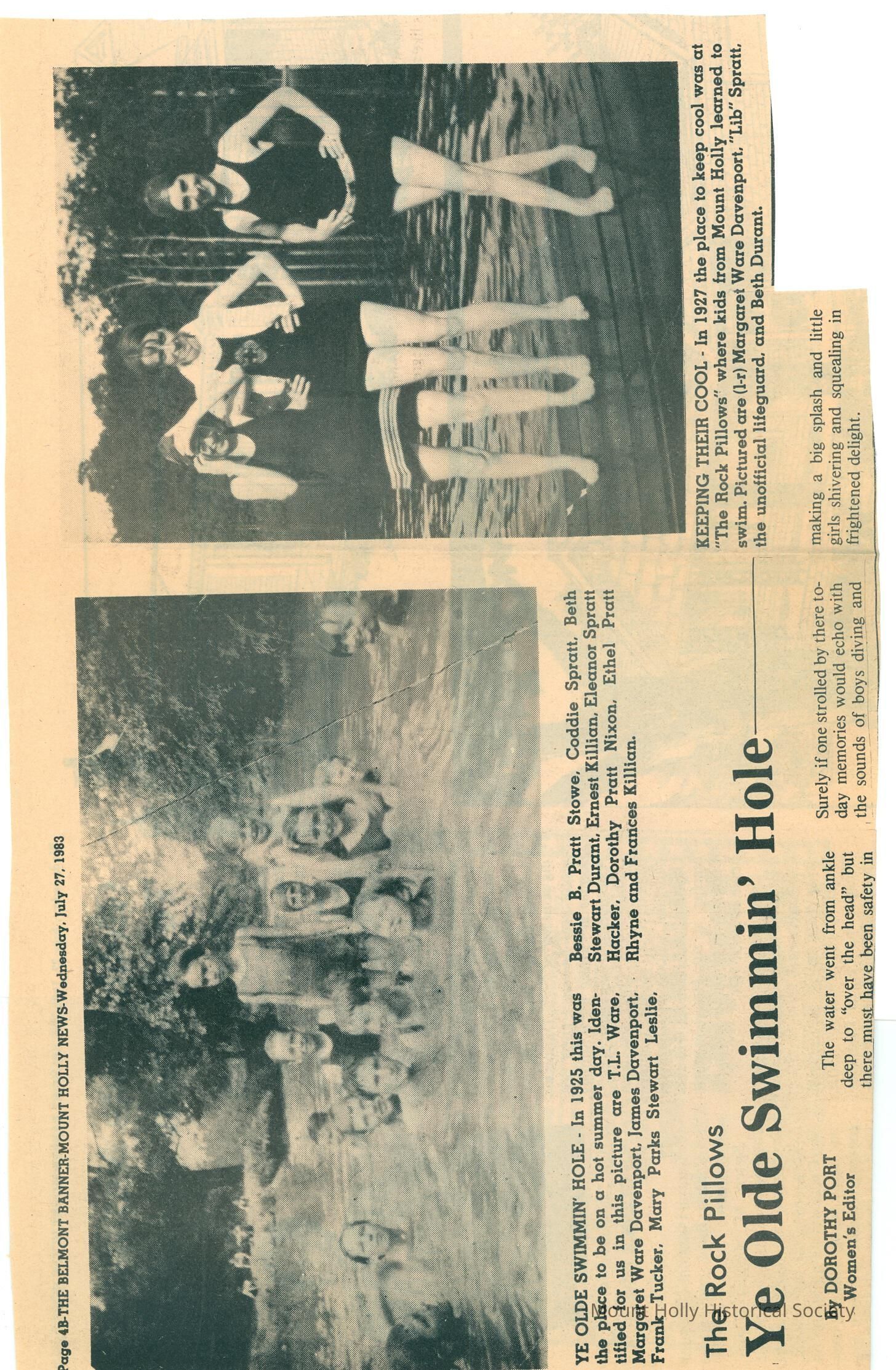 Article from "Belmont Banner" and "Mt. Holly News" by Dorothy Port, describing old swimming hole in 1920s (only top half of article scanned)