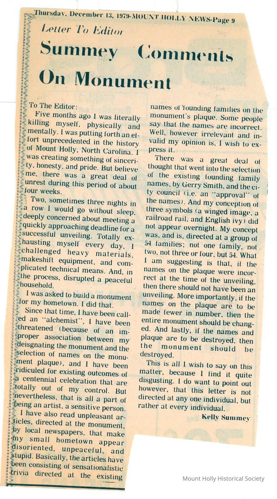 Letter to the editor of the "Mt. Holly News" from Kelly Summery, designer of the Mt. Holly Centennial Memorial, defending the monument