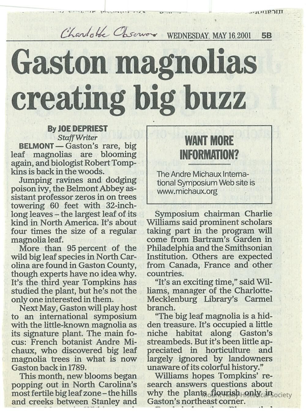 Article from "Charlotte Observer" (folded in half) about symposium for Andre Michaux and big-leaf magnolias