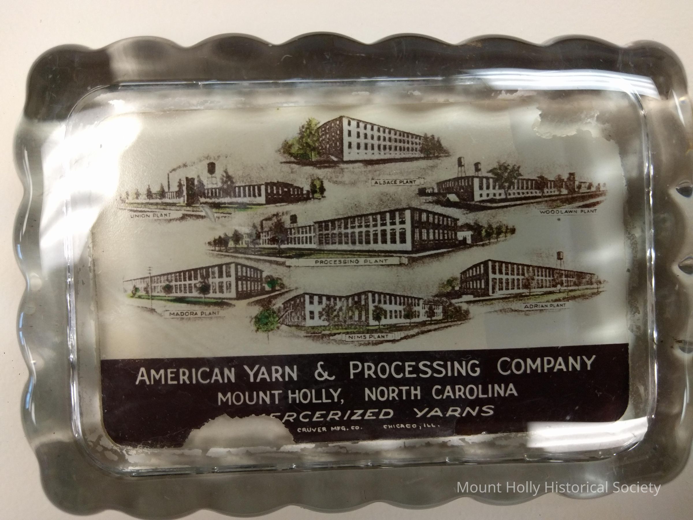 Clear glass paperweight from American Yarn Mill, 4.5" x 3" "American Yarn and Processing Company, Mount Holly, North Carolina, Mercerized Yarns"