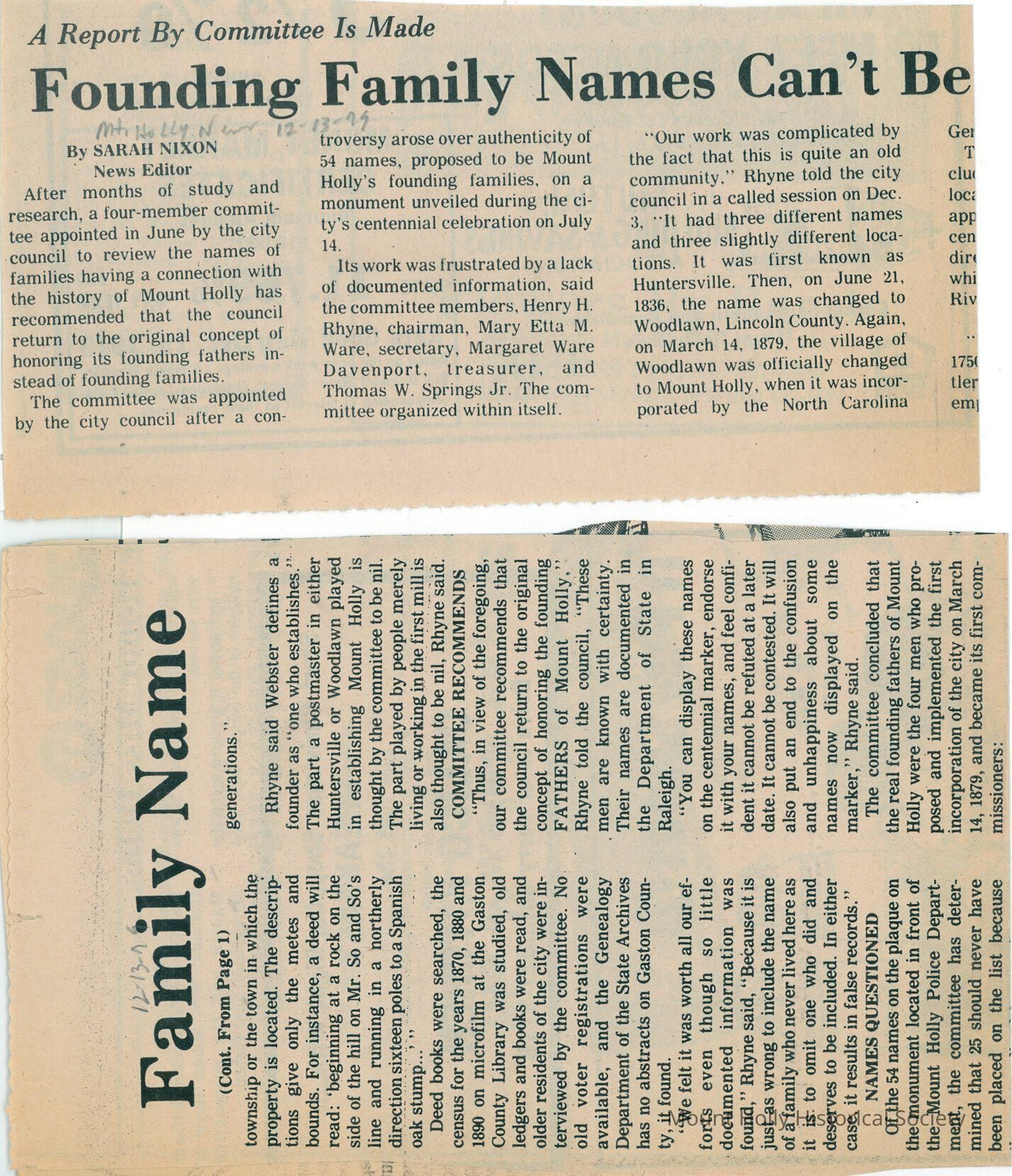 Article from "Mt. Holly News" by Sarah Nixon (two pages, folded) describing controversy over the centennial memorial, resolved by excluding several names from the list