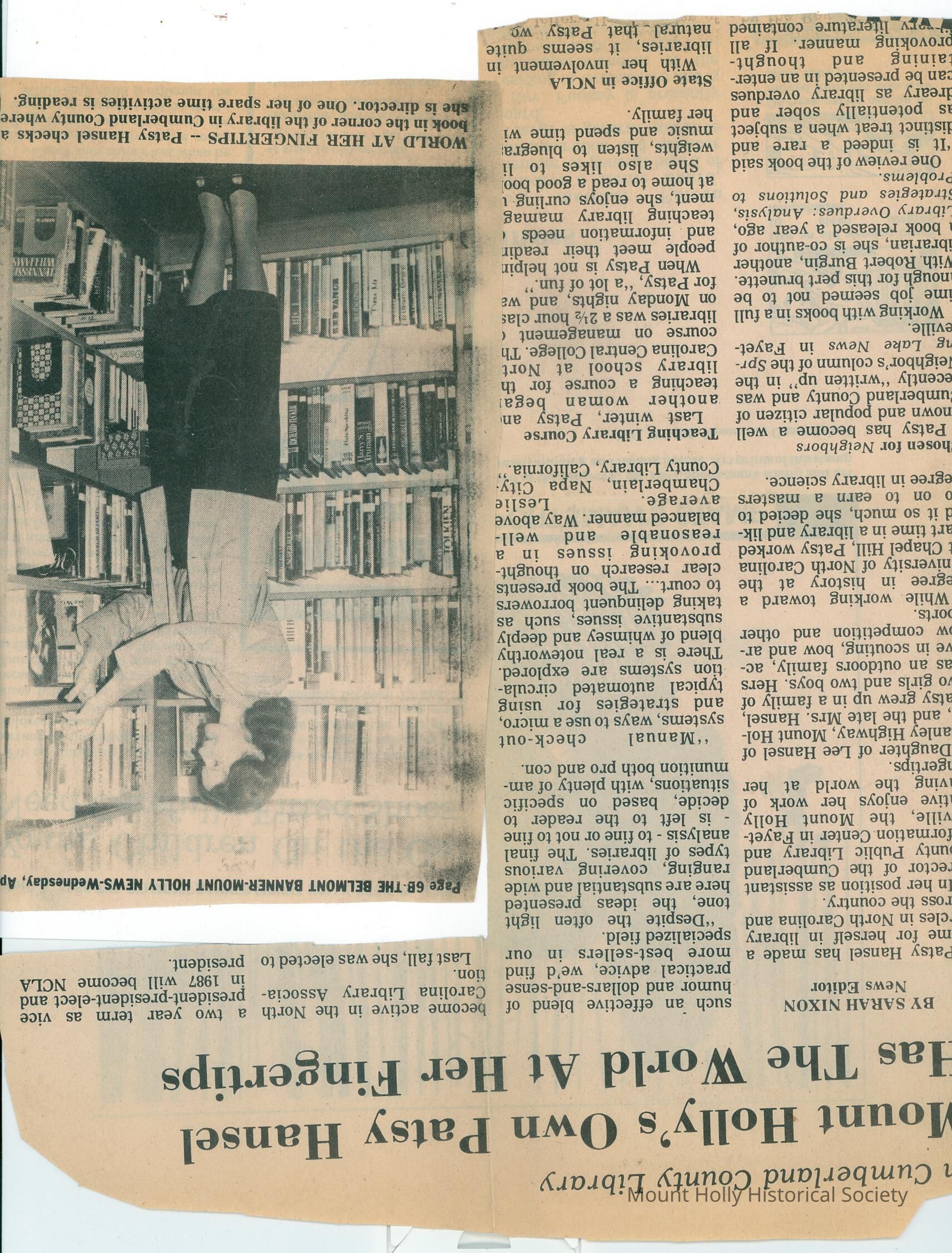 Article from "Belmont Banner-Mt. Holly News" by Sarah Nixon describing Patsy Hansel, born in Mt. Holly, working in Fayetteville as a librarian