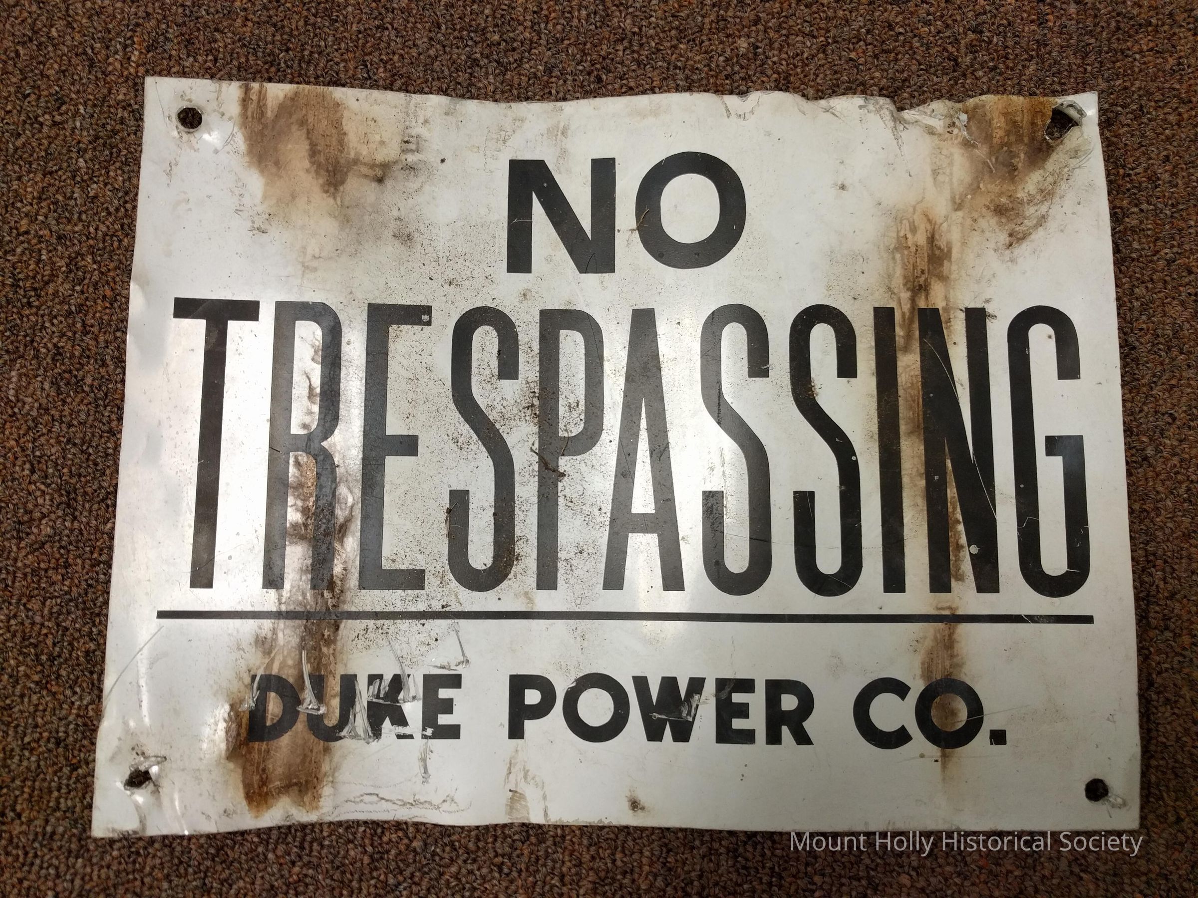 White sign with black lettering, 12" x 9" Mountain Island Ferry "FERRY MT ISLAND" Back: "No Tresspassing, Duke Power Co"