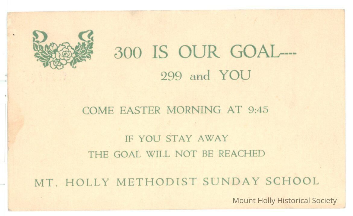 Postcard (wihout address) from Mt. Holly Methodist Church urging people to attend Sunday School to reach goal of 300 attendees (front and back scanned)