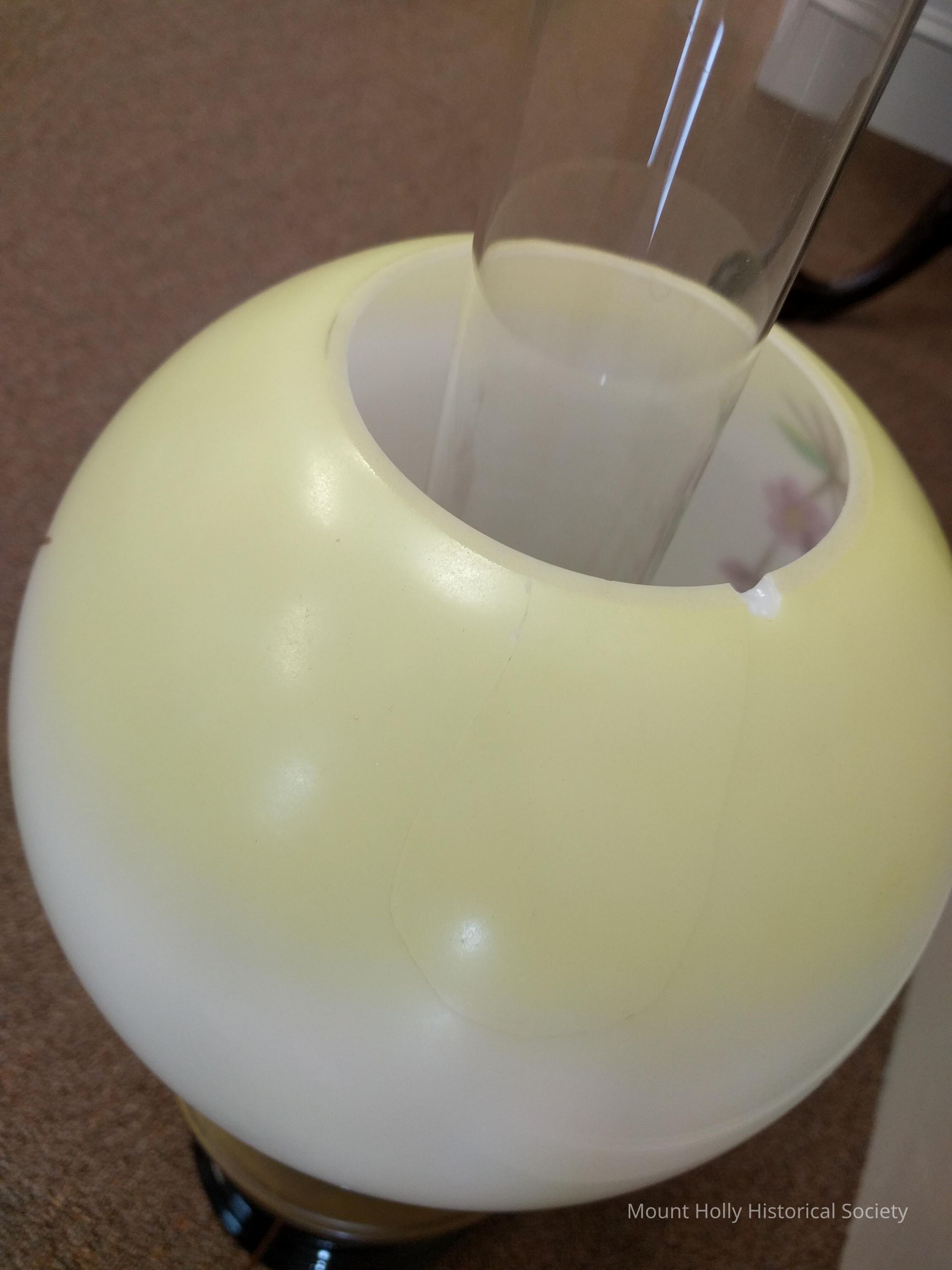 Brass electric lamp made to look like oil lamp with glass floral globe, some cracks and chips in globe, 23.5" tall