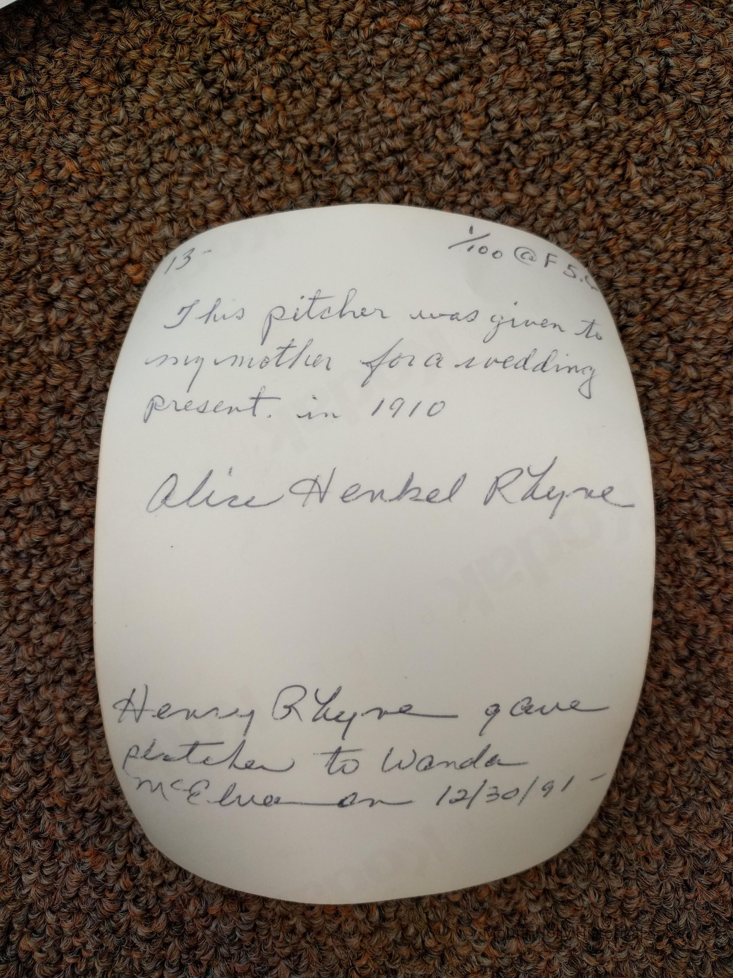 Glass pitcher with raised pattern, 10.5" tall Donated by McElveen family "Wedding gift to Alice Henkel Rhyne in 1910, Given by Henry Rhyne to Wanda McElveen 12/31/1991"