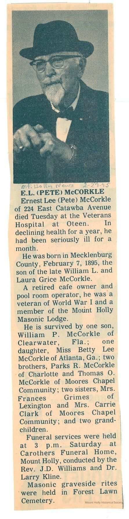 Obituary from "Mt. Holly News" for E.L. "Pete" McCorkle, a veteran of the First World War