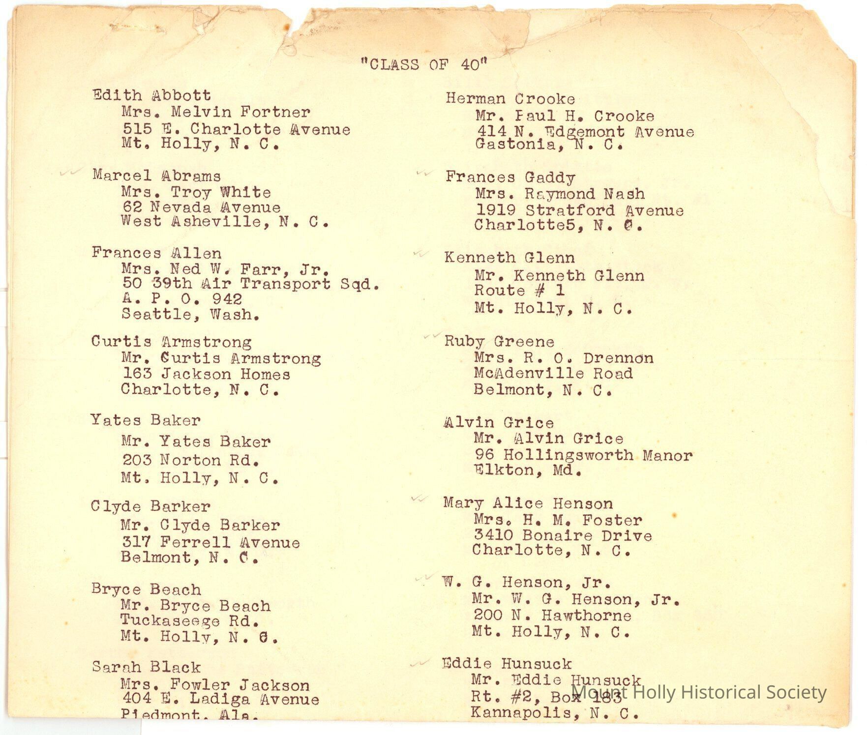 Typed list of members of the Class of 1940, with mailing addresses; some names have check marks beside them (ony first half of first page scanned)