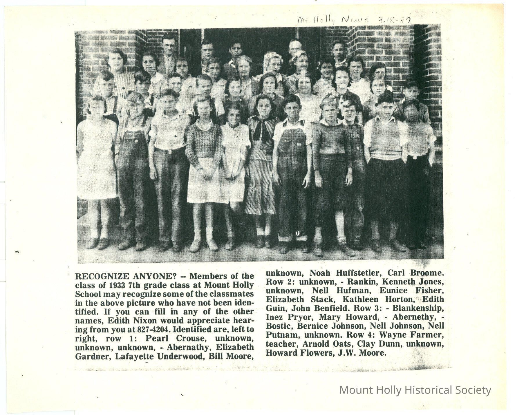 Photocopied black-and-white photograph from "Mt. Holly News" of seventh-grade class of 1933 at Mt. Holly School, asking readers to identify unknown people