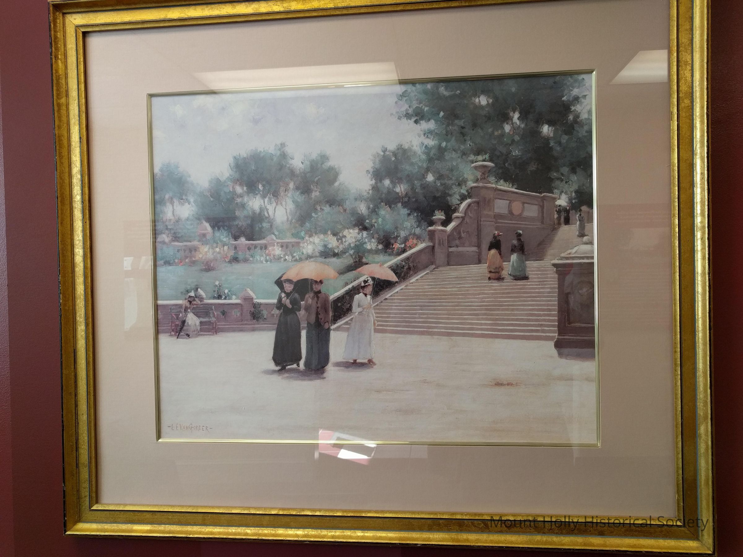 Framed print, LE VanGorder, ladies with umbrellas in garden
