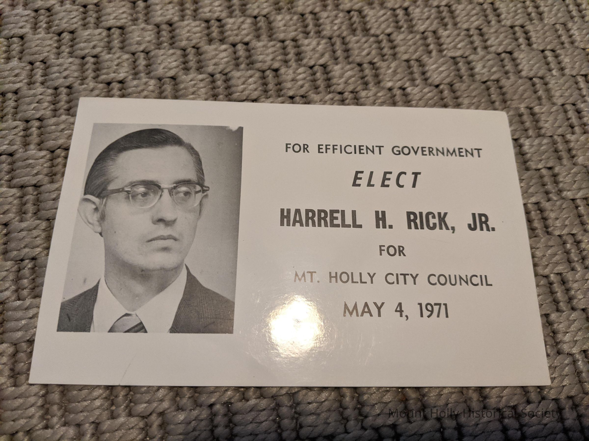 Election advertisment card for Harrell H Rick, Jr to Mount Holly Cuty Council May 4, 1971