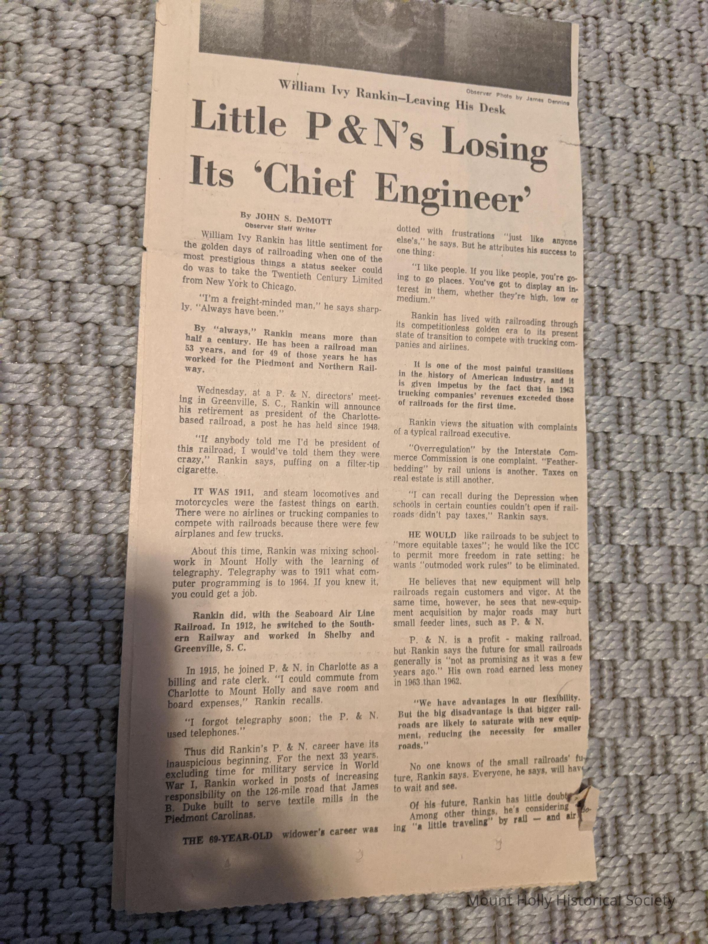 Charlotte Observer newspaper clipping - William Ivy Rankin, Chief Engineer leaving Piedmont & Northern Railway Co