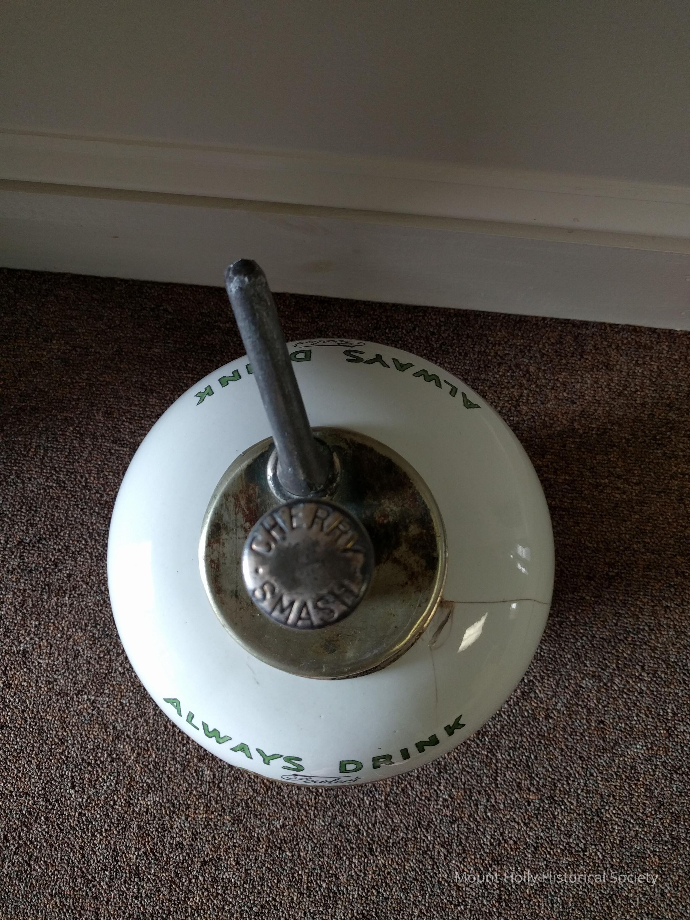 Chery Smash syrup dispenser On loan from Garrett Helms "Always drink Fowler's Cherry Smash Our Nation's Beverage" Multiple cracks, mended
