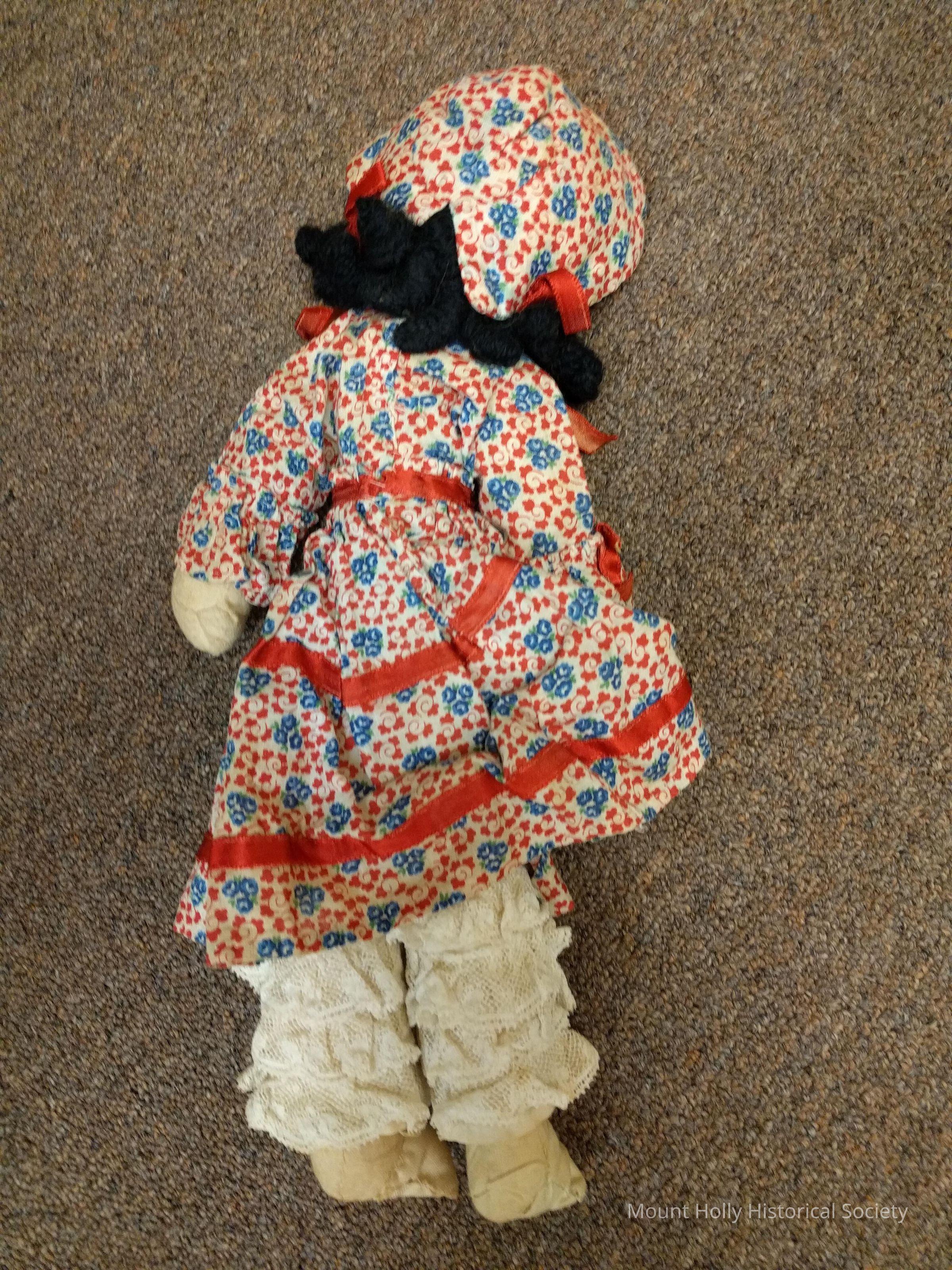 Cloth doll, handmade Black hair (yarn), red and blue spotted dress with red ribbon