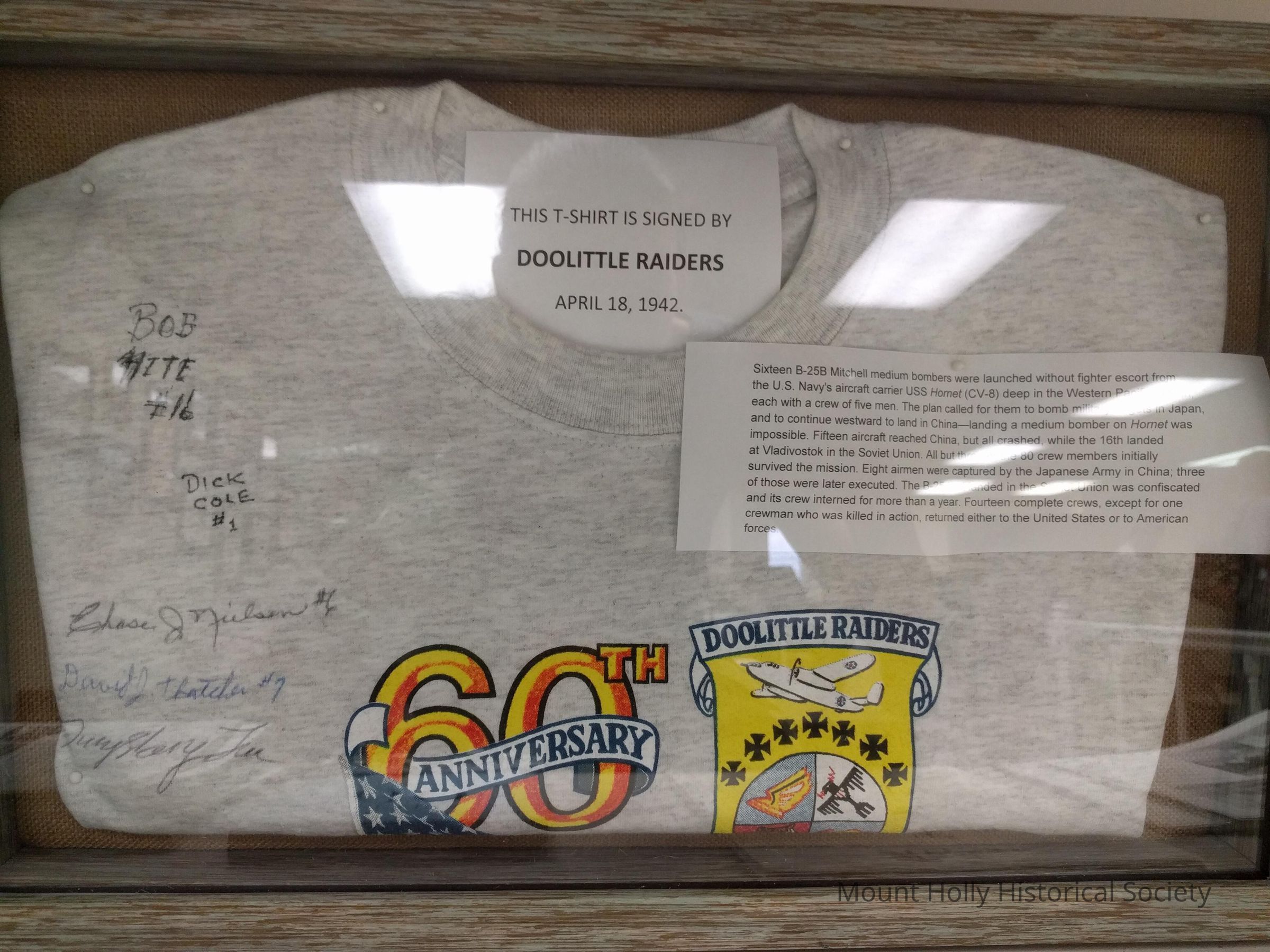 60th Anniversary t-shirt of Doolittle Raiders (April 18, 1942) signed by R L "Bob" Hite #16, R E "Dick" Cole #1, Chase J Nielsen #6, David J Thatcher #7, Tung-Sheng Liu
