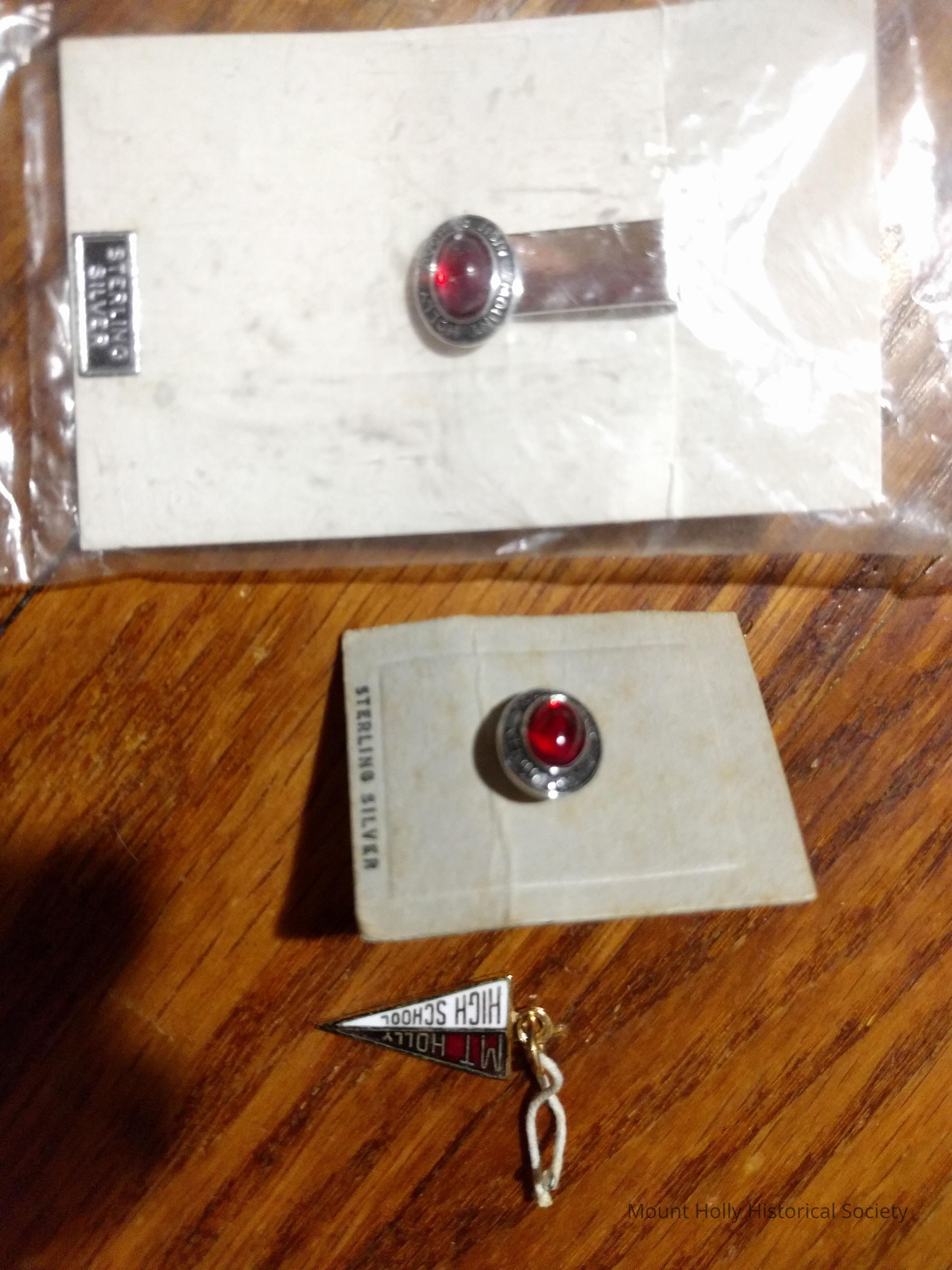 Mount Holly High School, Pin Charm and Lapel Pin inside plastic, St. Moritz Jewelry Case