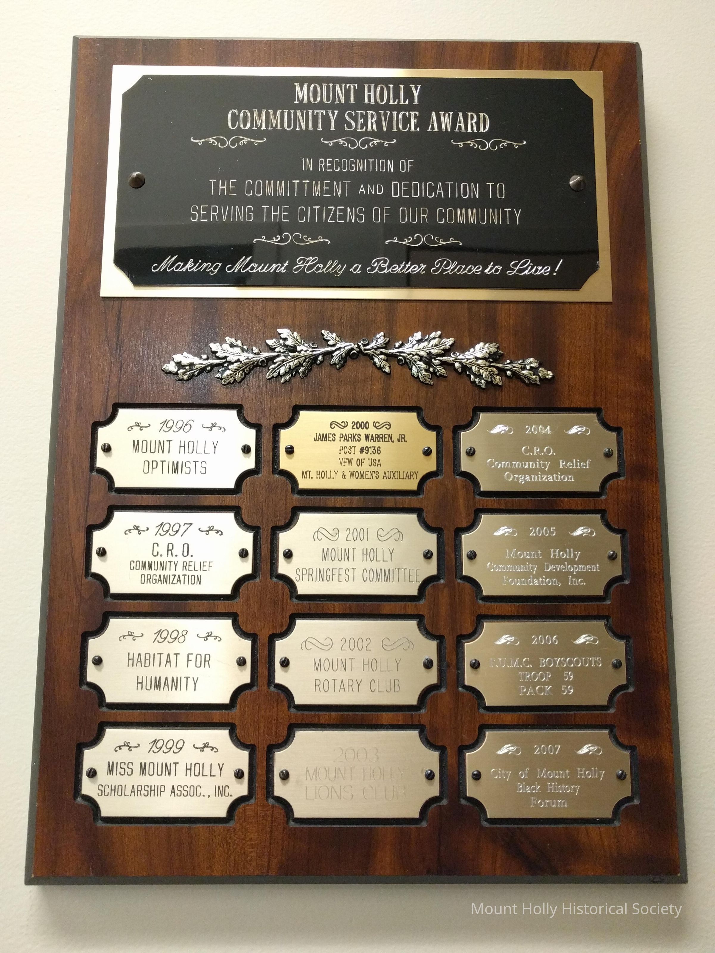 Mount Holly Community Service Award Plaque